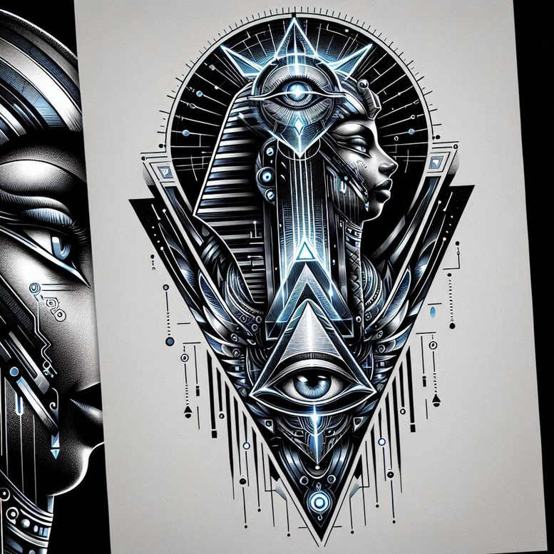 AI-generated tattoo project presenting a pharaoh-inspired head adorned with a ceremonial headdress, anchored by a geometric eye-triangle motif. The central profile is rendered in black and grey with crisp fine-line shading, high contrast, and architectural linework. A series of triangles, chevrons, and circuitry-like vectors radiate outward, creating a symmetric mandala-like frame that folds into an inverted triangle beneath the profile. The all-seeing eye sits within a triangular pyramid at the heart of the composition, its iris treated with subtle gradient shading to convey depth. Blue accents illuminate selected edges and focal points, adding a cool glow to the design while preserving the monochrome backbone. The piece blends Egyptian iconography with modern geometric tattoo language, resulting in a bold, scalable design that can fit on the forearm, upper arm, chest, or back. The technique emphasizes clean outlines, smooth transitions between blacks and midtones, and deliberate negative space to preserve readability when inked at smaller scales. This tattoo design carries symbolism around protection, insight, and timeless authority: the pharaoh as guardian, the eye as vigilance, and the triangles as direction and focus. As an AI-generated tattoo project, it offers a robust starting point for a custom tattoo design, inviting clients to adapt the geometry or incorporate additional motif flavors like lotus flower tattoo, infinity tattoo, tribal tattoo, or Japanese style tattoo elements while maintaining black and grey realism. For collectors of meaningful tattoos, this piece delivers a distinctive pattern-driven aesthetic that merges art-deco geometry with ancient symbolism, delivering body art that reads well from distance and rewards closer inspection. In sum, the composition is a confident statement in line work and shading, with a cover-up friendly approach thanks to the dense black ink blocks and strong shapes that can comfortably mask older ink.
