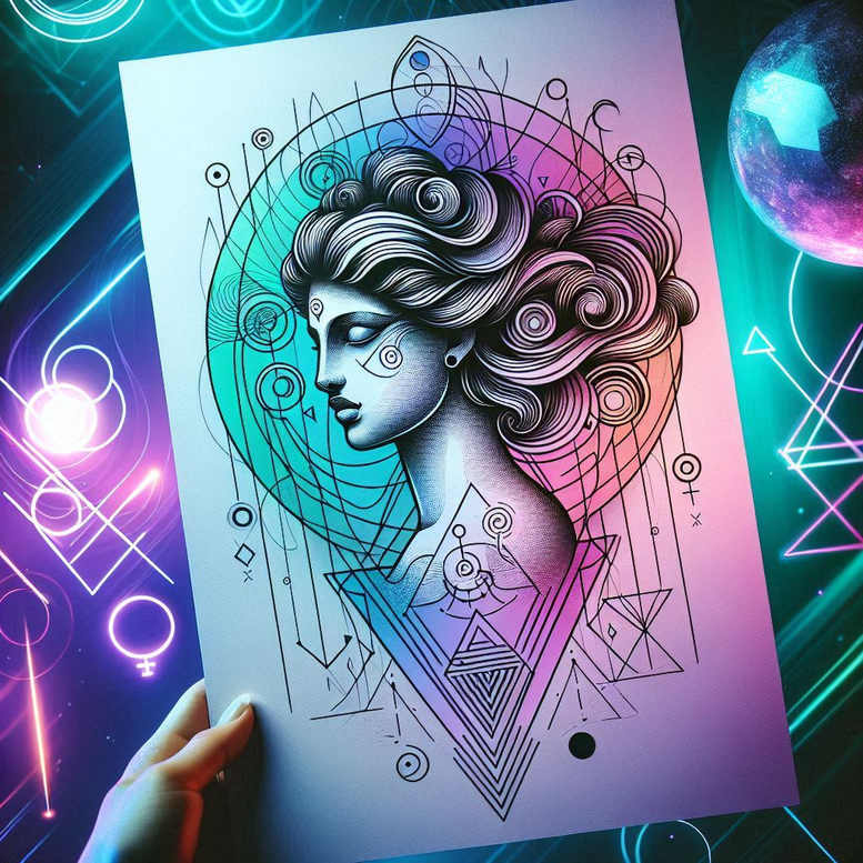 This Aphrodite-inspired tattoo design presents a mythic profile of the goddess set within a meticulously engineered geometric mandala. The goddess’s coiffure flows in stylized waves, anchored by a crown of lines and circular motifs that converge into a central diamond frame, creating a sense of movement and cosmic symmetry. The composition blends classical iconography with contemporary line art, where fine-line contours render the profile with delicate precision, while surrounding motifs—interlocking circles, triangles, and repeating geometric bands—form a pattern that reads as sacred geometry and a modern body art statement. The color scheme relies on blue-tinged lines and lavender accents to emphasize depth without overpowering the composition, evoking both the sea and antiquity that define Aphrodite’s realm. Meaning and symbolism thread through the design: Aphrodite embodies beauty, love, and transformation; the circular mandala represents unity, eternity, and the cyclical nature of desire; the geometric motifs signal balance between chaos and order, a dialogue between myth and modern tattoo practice. The piece demonstrates how fine line tattoo technique can render delicate features—the goddess’s profile, eyelashes, and the gentle curvature of hair—while the geometric halo provides rhythm and structure. As a whole it functions as a meaningful tattoo concept for those seeking a symbolic portrait rather than literal realism, and it fits comfortably within the realm of custom tattoo design and modern body art. The artwork is presented as a project/idea in this gallery context, and while it nods to traditional Greek myth, it is conceived for contemporary audiences. This design is AI-generated, illustrating how algorithmic patterning can elevate classical iconography into a color-rich tattoo concept that remains legible and durable on skin. In practice, the composition balances negative space and line weight to ensure readability when inked at small scales or on larger canvases, making it a strong candidate for a timeless tattoo design or a standout small tattoo.