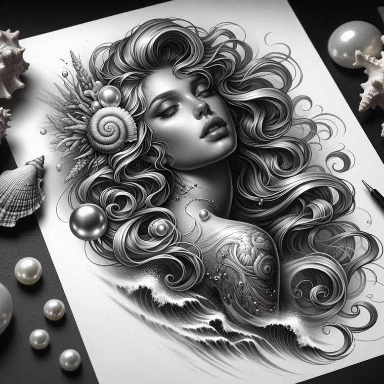 This black-and-grey fine-line tattoo design presents an Aphrodite-inspired portrait that fuses classical myth with contemporary ink aesthetics. The composition centers on a poised woman whose face conveys serene power, her gaze lifted as if listening to sea winds; her hair unfolds in lush, curling strands that sweep across the canvas of skin like a living sculpture. A delicate seashell motif crowns the goddess, echoing the birth of Venus from the sea and symbolizing beauty, birth, renewal, and the protective aura of love. Subtle patterns trace the chest and collarbone area, resembling jewelry or armor, which enriches the piece with a ceremonial, timeless aura while preserving legibility for a range of sizes in tattoo design. The artist employs meticulous fine-line techniques and smooth gradient shading to render skin tone, textures, and the subtle glow of moonlit skin, creating a realistic tattoo vibe while retaining the airy clarity characteristic of fine-line work. The black-and-grey palette enhances contrast, mood, and timeless appeal, making the image versatile for personal meaning—from empowerment and feminine strength to love and desire—while remaining adaptable to different placements on the body. The symbolism is deliberate: Aphrodite epitomizes love, attraction, beauty, and the healing power of affection; the shell motif reinforces birth, mystery, and the sea’s enduring influence on beauty. As a meaningful tattoo, it invites reflection on myth, femininity, and personal narrative, and it performs well as a standalone piece or a centerpiece within a larger sleeve or back design. This AI-generated concept is intended for thoughtful ink collectors who value a refined, realistic tattoo tone, and it signals a sophisticated option within the realm of meaningful tattoos, custom tattoo design, and classic myth-inspired body art.