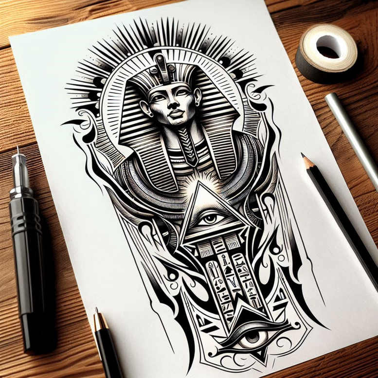 This AI-generated tattoo project presents a bold black-and-grey linework composition centered on a sphinx figure crowned with a ceremonial headdress, with a geometric pyramid and an all-seeing eye above it. The design sits within a frame of radiating glyph-like ornamentation and symmetrical flourishes that guide the eye along the central axis, producing a strong silhouette suitable for placement on the arm, back, or chest. Crisp outlines and dense hatching create depth while preserving the high-contrast clarity prized in fine line tattoo aesthetics; the sphinx’s features are stylized yet expressive, with hieroglyph-inspired detailing that nods to ancient symbolism. The pyramid is rendered with precise facets and an eye at its apex, evoking knowledge, protection, and mystique, while surrounding motifs weave into sweeping curves that generate a pattern-rich border. This tattoo design communicates themes of insight and power, making it a meaningful option for collectors of black-and-grey ink and for fans of Japanese-style, tribal, or realistic tattoo influences, as it blends ancient iconography with contemporary linework. In terms of execution, the piece translates well as a standalone chest or sleeve motif or as a bold back-center canvas; its bold black lines guarantee legibility and impact over time, and its balanced composition ensures adaptability to different body locations. If you’re seeking a custom tattoo design with meaning and graphic punch, this concept offers a solid blueprint to guide an artist toward a one-of-a-kind piece. The image is AI-generated, reflecting a modern approach to tattoo concepts, but the final ink can be refined by hand to suit individual anatomy, skin tone, and preferred shading.