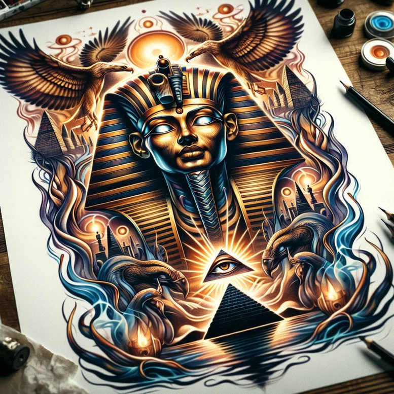 This is an AI-generated tattoo project that fuses ancient iconography with contemporary graphic style in a bold, pattern-rich composition. The focal point is a stylized pharaoh mask inspired by Tutankhamun, rendered in metallic gold tones and deep blue-black shading to create a sculptural, almost three-dimensional presence. Behind and around the mask, a pair of outstretched wings frames twin pyramids, anchoring the scene in a geometric landscape that reads as a continuous pattern. A luminous sun orb and the Eye of Providence hover above, radiating energy that echoes through the carved lines and negative space. Lower edges swirl with electric cobalt blues and coppery tones—reminiscent of waves or smoke—that guide the eye toward a striking triangular motif evocative of sacred geometry. The color palette remains full-color, delivering high contrast and a dramatic, tattoo-ready look, while crisp line-work and bold shading blend realism with stylized graphic elements. Symbolically, the pharaoh represents protection, wisdom, and endurance; the Eye of Providence suggests guidance, while pyramids imply immortality and stability. The piece fuses tribal-inspired shapes with a modern Japanese-style precision, resulting in a visually compelling tattoo design suitable for large areas or prominent placements. This meaningful tattoo concept can be adapted to black and grey if desired, but its current full-color form asserts a strong narrative in body art. For those considering a cover-up, the dense pattern and bold contrasts make this design an excellent candidate to mask older work while preserving dramatic impact. Keywords woven throughout include tattoo, tattoo design, meaningful tattoos, fine line tattoo, lotus flower tattoo, infinity tattoo, tribal tattoo, rose tattoo design, small tattoos, flower tattoos, custom tattoo design, Japanese style tattoo, black and grey, realistic tattoo, body art, ink.