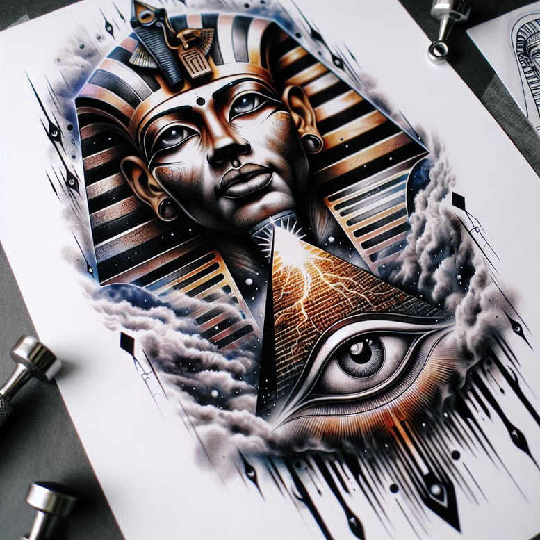 This concept presents a bold tattoo design that merges ancient symbolism with contemporary geometry. At its core rests a pharaoh mask, carved with meticulous shading to convey the gleam of polished stone and the ceremonial gravitas of the nemes headdress. A wide, all-seeing eye sits within a rising triangular pyramid, creating a central focus that invites reflection on perception, protection, and inner sight. Surrounding elements—clouds, crisp linear work, and diamond motifs—establish a disciplined rhythm, while the striped bands of the nemes headdress echo iconic Egyptian iconography. The piece uses a black and grey palette with selective orange accents to guide attention to focal points without sacrificing overall harmony. Technique stresses smooth gradient shading for the mask, precise linework for the geometric components, and subtle feathering to blend the surrounding clouds with the sharp edges of triangles and diamonds. This is an AI-generated tattoo project concept, designed to read as a sophisticated tattoo design suitable for larger canvases and sleeves, yet adaptable to smaller placements for fans of meaningful tattoos. The imagery carries layered symbolism: Egypt’s ancient wisdom, the eye of enlightenment, and the triangle as a doorway to higher awareness. The composition leverages pattern repetition and negative space to achieve visual balance, reflecting trends in modern black and grey realism and pattern-driven tats that value rhythm and structure. For tattoo lovers, the design offers a flexible framework that can accommodate additions such as lotus flower tattoo or infinity tattoo motifs, or be reinterpreted in Japanese style tattoo lines or tribal tattoo accents while preserving legibility. From a practical standpoint, the piece provides a strong silhouette and crisp readability of the key forms from a distance, with detailed texture that rewards closer inspection. In sum, it stands as a versatile, meaningful tattoo concept that can anchor a back, chest, or sleeve project, while remaining adaptable to different skin tones and placements, and serving as a striking example of modern ink artistry, or body art in black and grey ink. The motif can pair with rose tattoo design elements or floral motifs, including lotus flower tattoo or flower tattoos, and remains a strong example of custom tattoo design, black and grey realism, and ink artistry.