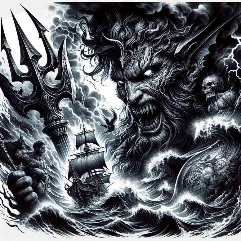 These are AI-generated tattoo projects, presented as concept work for ambitious collectors and artists. This piece proposes a dramatic, cover-up-ready black and grey composition that fuses mythic sea imagery with storm-tossed drama. A towering face of a sea demon dominates the composition, its features carved with dense linework and heavy shading that dissolves into circling foam. To the left, a menacing trident rises in relief, its curvature guiding the eye toward a battered sailing ship caught in towering waves. In the troughs and spray, skeletal forms peer through the spray, adding a Gothic counterpoint that deepens the narrative. The treatment relies on bold contrasts: true black fills, crisp white highlights, and a lattice of fine lines, stippling, and cross-hatching to evoke wind, spray, and rope smoke. The result is a pattern-rich tattoo design, where every element—face, weapon, vessel, water—flows into the next to create a single, seaborne saga. The symbolism is open to interpretation: the demon could symbolize inner storms, the ship a journey through adversity, and the swirling waves a constant change of fate. Technically, the piece leverages strong edge definition and careful layering to maintain legibility on skin even as it expands across a large area. This concept also illustrates AI-origin production, which can accelerate client reviews while remaining suitable for a traditional tattoo workflow and craftsmanship. From a style perspective, it sits in a black and grey, realistic-leaning realm, with graphic patterns and a heroic scale that makes it a standout piece for a back, chest, or sleeve placement. In short, this is a high-impact tattoo design that prioritizes atmosphere, narrative, and memory—an ideal candidate for a custom tattoo design that tells a story in ink while offering considerable cover-up potential.