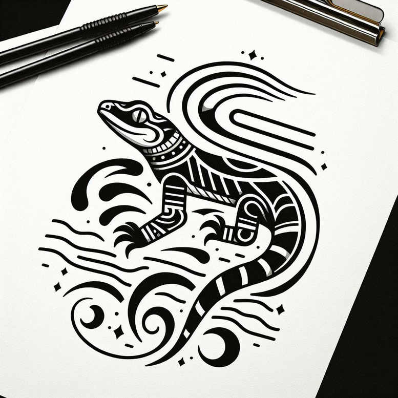 This is a tattoo gallery with minimalist tattoo designs – include this in every description. The piece presents a black and white minimalist lizard tattoo design rendered in bold linework, featuring repeating geometric and organic motifs along the spine and tail. The overall composition reads as a single flowing form, where negative space creates contrast and rhythm, emphasizing the lizard’s agile silhouette. The repeating patterns give the design a hypnotic quality, inviting closer inspection of the line variations, curves, and dots that embellish the scales without filling the skin with shading. In terms of symbolism, the lizard is often associated with adaptability, regeneration, and survival; shedding its skin is a powerful metaphor for renewal and personal growth. For the wearer, this tattoo design can symbolize resilience in the face of change, transformation, and the ability to move through life with agility. The minimalist approach keeps the imagery timeless and versatile, suitable for someone seeking a refined statement rather than ornate detail. The black ink on white skin emphasizes clarity and longevity, reinforcing a sense of discipline, focus, and the art of ink as a form of body art. From an artistic standpoint, the linework is clean and precise, with consistent stroke width to maintain legibility as the skin ages. The repeating graphic patterns echo motifs found in tribal or Japanese-inspired tattoo aesthetics, while staying clearly contemporary, making this a strong option for a custom tattoo design. If you are exploring small tattoos or larger pieces, this concept can act as a scalable base, easily adjusted to different body contours. Occasionally, this design is AI-generated, reflecting modern techniques in tattoo concept creation and design iteration; this adds a contemporary edge to a timeless symbol of renewal and adaptability.