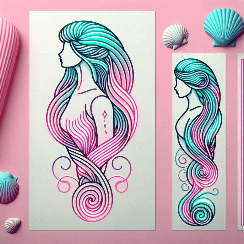 Part of a tattoo gallery with minimalist tattoo designs, this piece presents a colorful mermaid portrait rendered in fine line. The composition centers on a stylized female figure whose hair flows into looping curls that extend along the panel, creating movement and grace. The hair gradient shifts from turquoise to pink, executed with crisp, uninterrupted linework that relies on negative space to maintain clarity in a small format. Surrounding accents evoke seashells, adding a coastal symbolism of protection, femininity, and resilience. The two panels shown repeat the same motif with subtle scale variation, a deliberate patterning that reinforces rhythm and offers clear opportunities for variations in future commissions. The design works as both a standalone tattoo design and a conceptual starting point for larger work; its compact lines make it ideal for small tattoos on the wrist, ankle, behind the ear, or as a discreet cover-up option if needed. The mermaid motif symbolizes mystery, freedom, and transformation, with the curling lines representing water, tides, and life’s flux—an expressive metaphor for personal growth. The color work adds vitality while maintaining the delicate feel of a fine line tattoo; in black and grey versions this would read differently, but here multicolor ink highlights the fluid motion of hair and waves without compromising legibility over time. Note that the design is AI-generated, reflecting a fusion of traditional minimalist aesthetics with algorithmic precision to achieve balanced composition and color harmony. For practitioners, the concept offers a clear template for a focused small tattoo while preserving adaptability for customization, such as shell placements or dragonfly accents, aligning with trends in meaningful tattoos, body art, and custom tattoo design. In addition to its aesthetic appeal, the piece emphasizes the enduring symbolism of the sea, femininity, and resilience, inviting wearers to interpret personal narratives through a simple yet expressive silhouette. The resulting tattoo design is versatile for placement, suitable for first-timers seeking a tasteful introduction to color in fine line work, and perfect for clients who value both symmetry and subtle ornamentation.