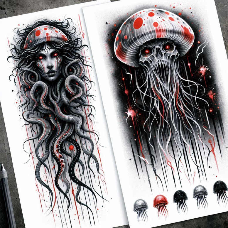 These two dark, AI-generated tattoo projects explore the tension between life and death through two companion motifs: a Medusa-inspired portrait ensnared by curling tentacles and a menacing jellyfish skull whose tentacles cascade into a black ink wash. Executed in black and grey with selective red accents, the pieces emphasize high contrast and meticulous linework that would read clearly from a distance while revealing intricate texture up close. The left design centers on a female visage—narrow eyes, sculpted cheekbones, and flowing hair that morphs into serpentine limbs—creating a graphic pattern that guides the eye downward in sweeping curves. The right design presents a skull masked by a jellyfish cap, its hollowed gaze illuminated by crimson highlights and long tendrils that streak downward in a dripping cascade, evoking both surrealism and macabre beauty. The two motifs read as a cohesive pair, suitable for a large sleeve or back piece, where the background can fade to negative space while the foreground remains densely detailed. Technique-wise, the works leverage smooth transitions of black to grey, with careful stippling and soft brush-work to mimic depth and skin texture, contrasted against sharp outlines for definition. The artist draws on classic motifs—Medusa, jellyfish, skull—reinterpreted through a modern, graphic lens that honors tattoo design’s potential for meaningful storytelling. From a symbolism perspective, Medusa represents transformation and protection, while the jellyfish skull hints at fragility and resilience, creating a dialogue about endurance. Given the image’s overall darkness and strong cover-up potential, these pieces would be ideal for concealing previous tattoos or scars, especially on larger canvases like the back, shoulder, or thigh. As AI-generated tattoo projects, they demonstrate how digital concepts can translate into original, ink-ready designs that maintain the tactile, hand-crafted feel of real tattoo art.