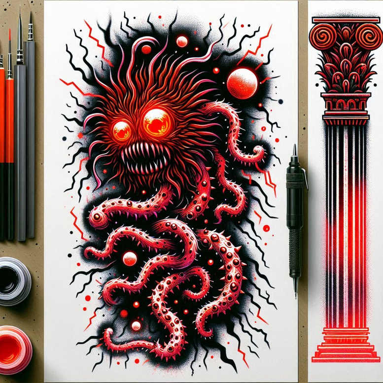This AI-generated tattoo project presents a confrontation with a graphic, tentacled creature. On a white sheet, bold black shadows carve the form while red accents ignite the eye and suction-cup textures, creating a dramatic focal point. The design blends elements of blackwork and neo-traditional tattoo design: dense linework, high contrast, and subtle airbrush shading that gives depth to each tentacle and the creature’s maw. A classical column on the right provides a vertical counterpoint to the wild organic shapes, while left-side pencils and ink jars signal this as a working concept ready for translation to skin. The image reads as a powerful cover-up candidate, where dense dark areas can be repurposed to mask previous tattoos beneath a new, cohesive motif. The central mass suggests a living force—an inner demon, resilience, or transformation—surrounded by spiraling limbs that wrap the form and guide the viewer’s gaze. In terms of technique, the design leverages black and grey shading, with selective red accents to emphasize key features: the eyes, suction cups, and energy arcs that ripple around the creature. The use of negative space around the tentacles heightens contrast and makes the subject pop off the skin, a hallmark of bold tattoo design. For tattoo clients seeking meaningful tattoos, this concept offers a strong narrative: a protective, sentinel-like monster that encircles the wearer with red vitality. As a stand-alone concept, it reads as a dark, cinematic piece with a futuristic edge, suitable for a large back or sleeve, or a cover-up where the red animal-motif can cleverly mask old ink beneath. For the practitioner, the piece documents a plan for a tattoo that balances graphic pattern with flowing organic shapes; the tentacles provide multiple anchor points for line work and shading, while the central orb-lit face gives a gritty, memorable focal point. The artwork reflects the ongoing trend toward high-contrast, full-color tattoos that pair dramatic black shadow with color accents, while remaining adaptable to body contours. If the client desires a meaning-driven tattoo, the motif can symbolize transformation, endurance, and the confrontation of one’s own demons, making it a suitable choice for meaningful tattoos, fine line tattoo adaptation, or a Japanese-style tattoo that embraces bold linework and dynamic composition. This is an AI-generated tattoo project, envisaged as a conceptual blueprint that can be refined into a final custom tattoo design, and its depth and density make it an excellent option for cover-up iterations where existing ink needs to be camouflaged with a creative new motif.