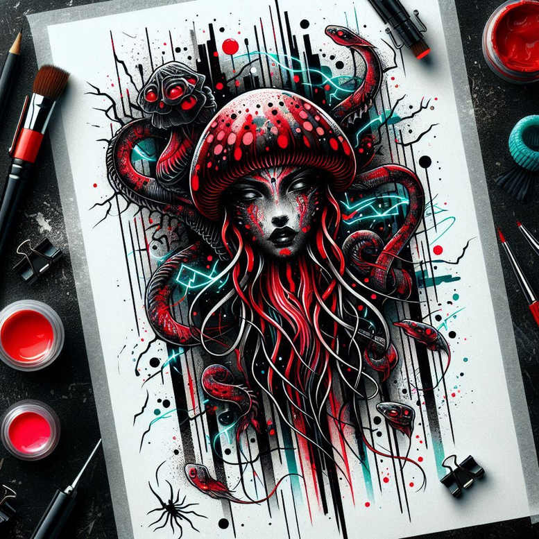 This dark, full-color tattoo design presents a neo-traditional Medusa-inspired portrait: a woman’s face framed by a red mushroom hat, with crimson snakes and sinuous tentacles curling around the head and torso, set against bold black linework and splattered accents. Rendered with precision, the piece pairs fine-line detailing for the facial features with heavier outlines on serpents and tentacles to create clear readability at various sizes. The turquoise highlights carve through the composition, giving energy and a modern edge while maintaining classic tattoo design sensibilities. The composition relies on vertical bar-like elements and splatter patterns that guide the gaze from crown to chin, producing a dynamic rhythm that translates well into a back piece, chest panel, or forearm motif. Symbolically, Medusa’s serpents evoke transformation, protection, and resilience, while the composed expression suggests control over chaos — a meaningful tattoo concept for those seeking empowerment. The patterning is deliberate: repeated serpentine motifs and geometric rhythm unify the piece, lending cohesion to a composition that would translate well to a large back or chest piece, or as an eye-catching forearm piece for someone seeking a custom tattoo design with Japanese style tattoo or neo-traditional influences. It can be adapted into black and grey for a more restrained look or rendered as full color to explode with crimson, black, and turquoise, appealing to fans of modern ink and body art. As an AI-generated tattoo project, this design demonstrates how algorithmic creativity can inspire impactful, large-scale tattoos while remaining suitable for cover-up applications, where existing ink can be masked and replaced with a bold, contemporary image.