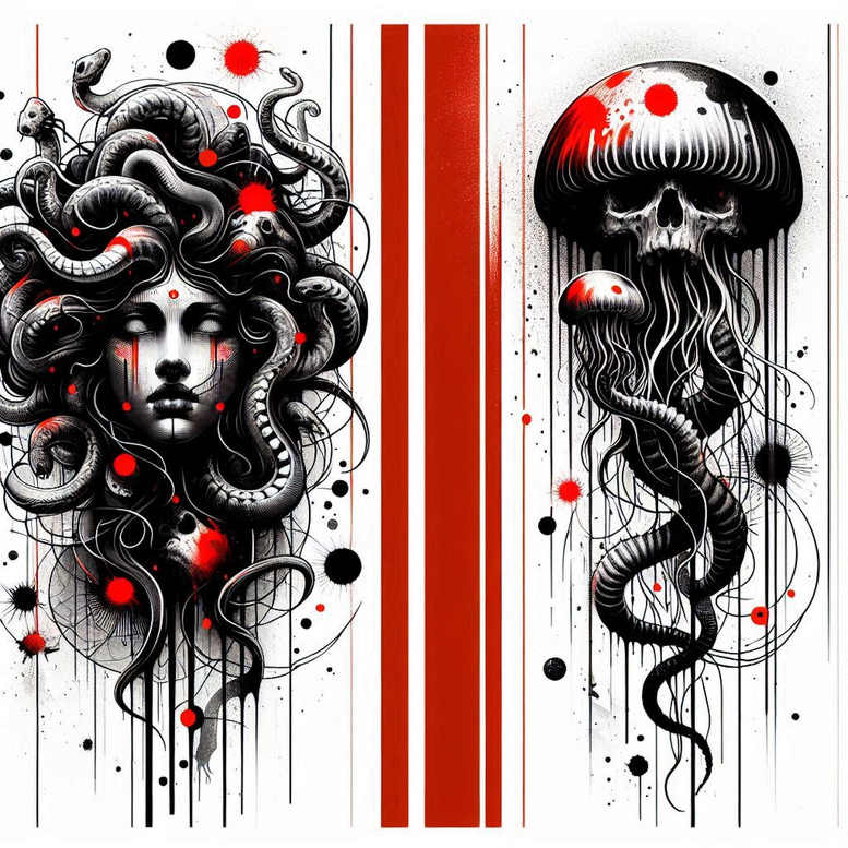 This design presents a split composition: on the left, a Medusa-inspired portrait with snakes entwined in the hair; on the right, a skull adorned with a mushroom cap, with fleshy tentacles and flowing line work. The panels are separated by bold vertical crimson bars and splattered ink, giving the piece a contemporary graphic rhythm. The left portrait uses meticulous black-and-grey shading to render the woman’s face with soft highlights, while the snakes are defined by crisp outlines and cross-hatching that conveys movement and tension. The right-hand figure, a skull fused with a mushroom, emerges with stark contrast, its dark hollows and sinewy tentacles weaving into the space around it; the mushroom cap sits like a crown, creating a focal point that balances the composition. The overall effect blends illustrative realism with stylized ink-drips and splatters typical of a bold tattoo design that commands attention. The color palette—predominantly black and grey with vibrant red accents—provides a dramatic mood that emphasizes form, texture, and negative space. The vertical bars function as a graphic divider and help conceal prior ink tones, underscoring the cover-up potential of this piece. Symbolically, Medusa represents danger, transformation, and the gaze that petrifies; the skull evokes mortality, while the mushroom imagery hints at growth within decay. Together, they tell a narrative about resilience and reinvention, suitable for meaningful tattoos and large-scale body art projects. As an AI-generated tattoo project, the concept is designed to be adaptable for cover-up work, with dense black areas offering excellent coverage when layered over older tattoos. Artists can translate it into fine line tattoo work or push toward a more realistic black-and-grey approach, integrating additional motifs such as lotus flower tattoos or roses if desired, while maintaining the strong graphic pattern that anchors the composition. In sum, this piece exemplifies a striking tattoo design with pattern, capable of becoming a signature work of ink, aligning with modern body art and custom tattoo design.