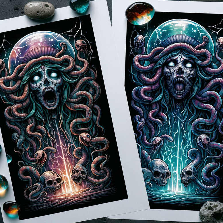 These two tattoo art panels present a dark, cinematic Medusa-inspired composition rendered in color-saturated realism. The central figure is a skeletal woman with hollow, glowing eyes, her face framed by a crown of coiling tentacles that sweep outward and descend toward the lower frame, where skulls rest upon cracked ground and electric arcs of blue light erupt from the fissure as if sunlight shattered the void. The tentacles weave a dense, graphic pattern that echoes across both sheets, creating rhythm and movement while leaving ample negative space to ensure bold readability on skin. Color choices—electric blues, ultraviolet purples, and warm flesh tones against near-black shadows—give the piece a neon, otherworldly presence, yet the shading remains smooth and nuanced to preserve the sense of depth and texture typical of a realistic tattoo design. The composition balances menace and beauty, inviting reinterpretation as a story of transformation, resilience, and hidden power; the skulls anchor mortality while the serpentine limbs symbolize uncertainty and adaptation. Technically, expect crisp line work, precise contouring, and layered gradients that translate well from paper to skin, preserving legibility for small tattoos or larger canvases such as forearms or thighs. Given its inherently dark tonal palette, this concept is particularly well-suited for a cover-up, allowing a skilled artist to mask prior ink while introducing new, dramatic imagery; the design also lends itself to customization in weight, line density, and color balance to match individual skin tone and preference. AI generation lies at the heart of this concept, providing a robust starting point for tattoo studios seeking bold, pattern-rich, high-contrast imagery; and while it references popular motifs like Medusa, skulls, and lightning, it remains adaptable to various styles—from Japanese-inspired shading to modern black-and-grey or full-color interpretations. The result is a striking body art statement built around a meaningful narrative, delivered in a scalable format suitable for tattoo enthusiasts pursuing a powerful design with lasting impact; in short, this is a complete, cover-up–ready tattoo design featuring a neon-lit Medusa spectrum, designed to endure as an iconic piece of ink.