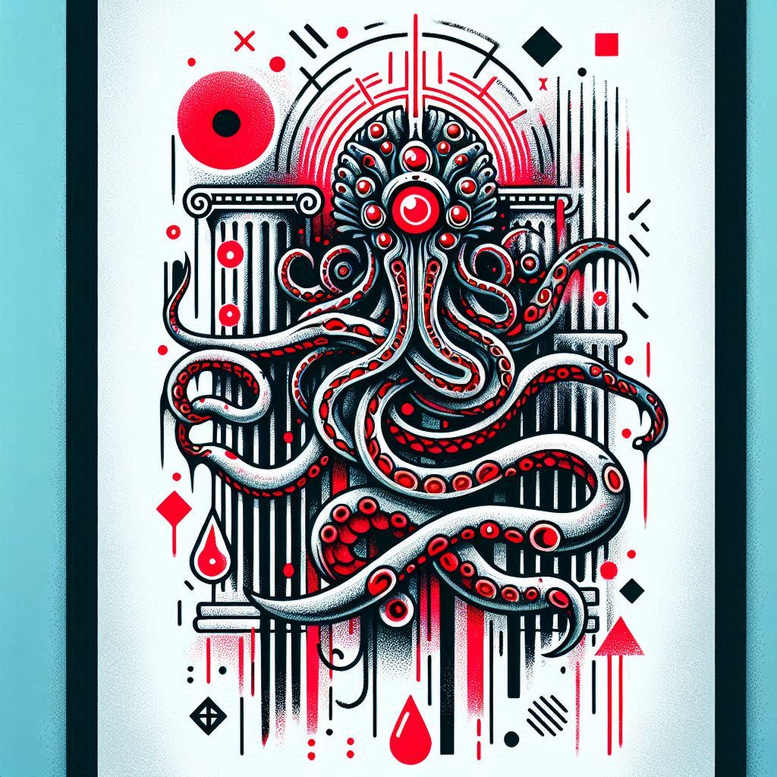 This is an AI-generated tattoo project, presented as a bold study in graphic marine life and architectural motifs. The central figure is an octopus whose sinuous tentacles sweep around two classical columns, a composition that plays with perspective and tension. The lines are crisp and heavy, with black and grey shading building volume along the suckers and the hooded mantle, while carefully placed red accents punctuate key nodes to draw the eye. Decorative elements—circles, diamonds, and fine line filigree—create a pattern-rich backdrop that reinforces the sense of motion and rhythm across the design. The tentacles wrap the columns in an organic lattice that sits between opulence and machine-age geometry, evoking both natural realism and contemporary tattoo art. The palette is deliberately restrained to black and grey with red highlights, ensuring strong contrast on skin and compatibility with classic blackwork or neo-traditional tattoo styles. Technically, the piece relies on bold contours, gradient shading, and stippling to simulate depth, while the interplay of negative space allows the figure to breathe on a canvas of various sizes. The symbolism is multi-layered: the octopus represents adaptability and intelligence, the columns denote strength and memory, and the surrounding geometric motifs suggest order within chaos. As a tattoo design concept, it translates well to a large backpiece or sleeve, but remains readable on smaller placements through scalable linework and deliberate contrast. This description intentionally integrates SEO keywords such as tattoo, tattoo design, meaningful tattoos, fine line tattoo, lotus flower tattoo, infinity tattoo, tribal tattoo, rose tattoo design, small tattoos, flower tattoos, custom tattoo design, Japanese style tattoo, black and grey, realistic tattoo, body art, ink. If used for cover-up projects, the bold silhouette and dense linework also offer strong coverage potential by blending darker elements into a cohesive new piece; the AI-generated origin of this project underscores its status as a digital concept ready for tattoo artists to customize and realize.