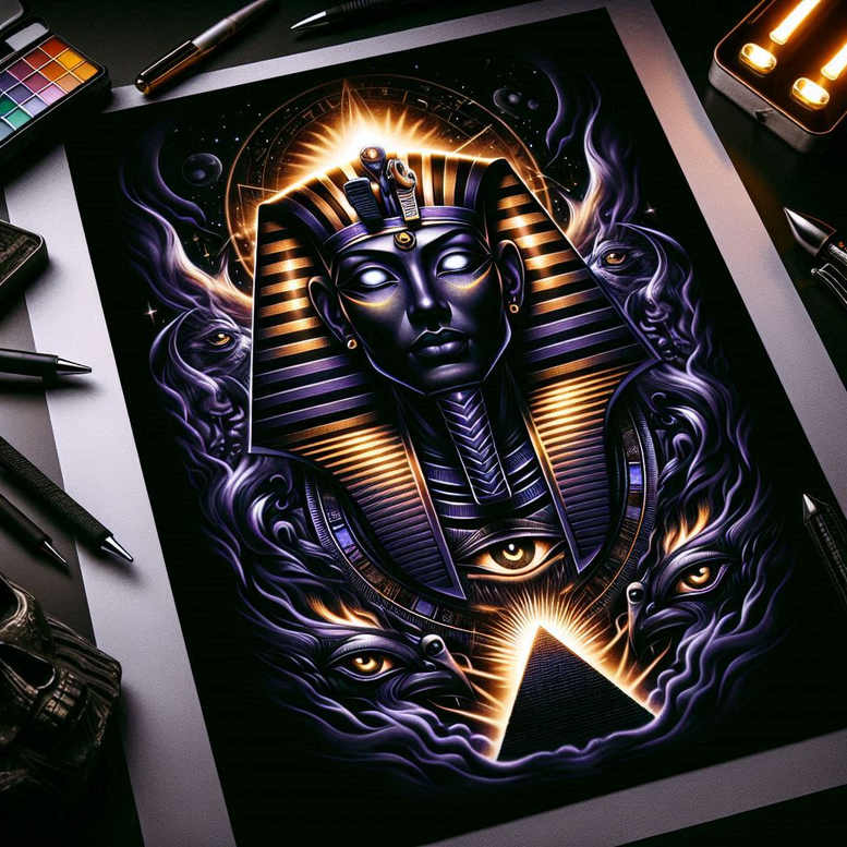 An AI-generated tattoo project, this composition presents a ceremonial pharaoh portrait rendered in a saturated full-color palette of purple-black skin tones and gilded gold against a deep obsidian backdrop. The central figure wears a striped nemes headdress, crowned with a radiant uraeus, and a halo that frames a glowing eye set in a triangle—the Eye of Providence—creating a focal point of mystic knowledge. Beneath the mask sits a stylized pyramid, while wisps of purple smoke coil around the edges, adding motion and a contemporary edge to ancient symbolism. The piece combines crisp, hyper-detailed line work with bold shading and smooth gradients to achieve a realistic yet graphic look, ideal for a large-scale body art tattoo on the back, chest, or arm. Its geometry—faceted headdress, stepped pyramid forms, and radiating light—gives it a pattern-like presence that remains legible from a distance. The design leans into a cover-up-friendly approach; the dense black shadows and neon highlights offer opportunities to mask prior marks while reinventing the composition as a striking centerpiece. Symbolically, the pharaoh signifies endurance, authority, and ancient wisdom, while the all-seeing eye embodies awareness and protection. This tattoo design blends Egyptian motifs with modern digital artistry, creating a meaningful concept that harnesses sacred geometry and high-contrast color to produce bold body art. In practice, the image demonstrates techniques relevant to tattoo enthusiasts and professionals alike, from fine line detailing to broad color blocks, and serves as an exemplary reference for commissions, coverage planning, and stylistic exploration in tattoo design and ink.