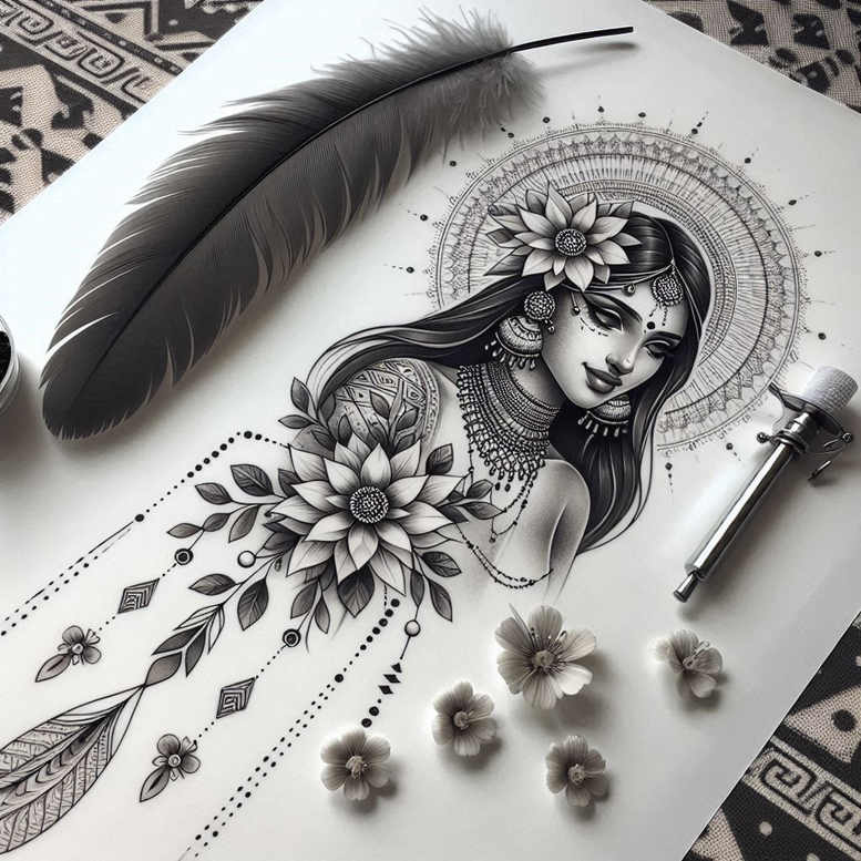 This is a black and grey fine-line tattoo concept featuring a female portrait accented by lotus flowers, leafy vines, and a detailed mandala halo. Executed in precise linework with measured shading, the composition balances delicate contour lines with dotwork texture to create depth across a small or medium canvas. The central figure, a serene woman with flowing hair, wears lotus blossoms and jewelry motifs that evoke bohemian and Japanese-inspired aesthetics. Surrounding elements include a radial mandala behind the head, dotted dividers, geometric motifs, and trailing vines that weave floral petals and smaller blossoms into the border. Symbolically, the lotus represents purity and awakening, while the mandala signifies balance and unity, and the jewelry hints at timeless ceremonial aura, making the piece meaningful for those seeking tattoo designs with personal symbolism. The technique emphasizes clean fine lines, smooth black and grey shading, and subtle gradations to produce a realistic yet stylized result. This AI-generated tattoo project concept explores how floral and spiritual motifs can be fused into a cohesive body art piece, offering a flexible path for a custom tattoo design or as a cover-up reference for scar concealment if needed. The motif can be adapted to a fully realistic style or reimagined in Japanese-inspired linework, and the palette can be expanded to color upon request; the core theme remains growth, serenity, and precision, with the lotus and mandala serving as focal anchors for a timeless tattoo experience. For those seeking meaningful tattoos, fine line tattoo techniques, flower tattoos, and intricate jewelry-inspired linework, this design provides a compelling blueprint for ink, a strong addition to portfolios, and a versatile template for future collaborations.