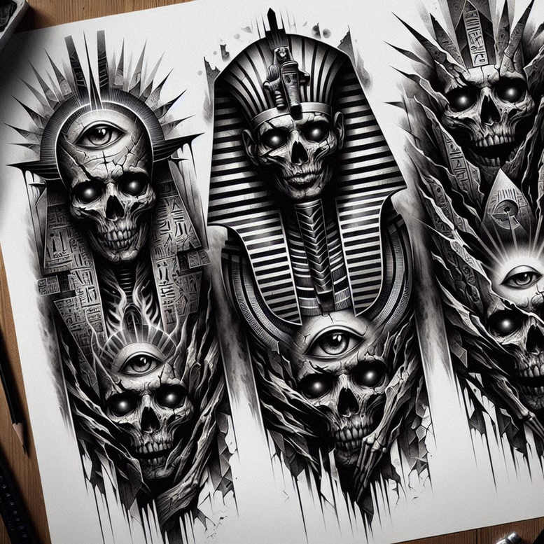 AI-generated tattoo project presented as a cohesive, large-format black and grey study: three skulls wearing stylized pharaoh headdresses, each rendered with meticulous shading and layered linework. The central motif features an all-seeing eye, perched within lines and pyramidal ribs that evoke sacred geometry and ancient stone relief. The surrounding spires and radiating shards extend downward into a jagged, leaf-like plume of negative space, creating a dramatic vertical composition that reads as a powerful cover-up option for older tattoos or darker skin tones. The design blends graphic realism with symbolic iconography—mortality, protection, and perception—into a single statement piece. Techniques emphasize contrast and texture: crisp outlines, smooth gray washes, stippled shading in deep shadows, and fine linework that suggests hieroglyphic textures and metal-like engravings on the headdresses. The pairing of skulls and eyes with geometric rays offers a cohesive narrative about seeing beyond mortality, while the monochrome palette reinforces timeless, tattoo-ready ink. Intended as a tattoo project, it serves well for a large back, chest, or sleeve layout where bold silhouette and negative space balance the dense black ink. For practitioners, this AI-generated concept demonstrates how to translate complex symbolism into a scalable design without losing legibility, while keeping the piece suitable as a cover-up if placed over older work. It also functions as an ideal blueprint for a modern Japanese-influenced black and grey or realistic tattoo workflow, and it integrates seamlessly with fine line techniques and pattern-driven shading. In short, this is a high-impact, pattern-rich tattoo design that embraces traditional motifs through a contemporary lens, designed to be inked as a stand-alone feature or as part of a larger mosaic. AI origin: occasionally noted; perfect for a cover-up and conversation starter about ink, meaning, and body art, with strong SEO: tattoo, tattoo design, meaningful tattoos, fine line tattoo, lotus flower tattoo, infinity tattoo, tribal tattoo, rose tattoo design, small tattoos, flower tattoos, custom tattoo design, Japanese style tattoo, black and grey, realistic tattoo, body art, ink.