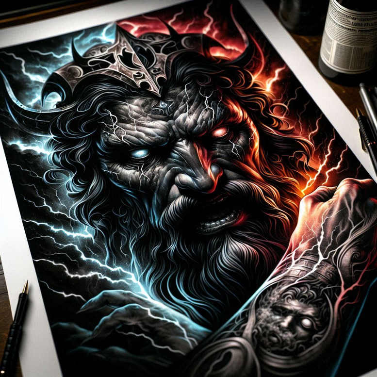 This AI-generated tattoo project presents a bold, high-contrast concept that merges mythic ferocity with modern tattoo realism. The central figure is a demonic face, its brow crowned with a jagged tiara, eyes and mouth carved in solid blacks and soft grey gradients. Blue and red lightning bolts fracture the composition, weaving through the hair and across the cheek, creating a dramatic split between cool and warm tones while preserving a cohesive grayscale foundation. The forearm motif visible at the edge echoes the main piece, offering a secondary portrait and intricate linework that reinforces the piece’s intensity. The technique relies on crisp outlines, smooth shading, and careful economy of color to simulate depth, texture, and motion, making the design suitable for a large-scale sleeve or a striking standalone arm tattoo. The crown signifies authority and protection, while the storm energy conveys power and transformation; together they form a meaningful narrative about resilience in the face of inner turmoil. As a custom tattoo design, it demonstrates how AI-assisted concepting can inform real ink, guiding an artist in translating digital lines into precise needles and pigments. For readers of tattoo culture and professionals alike, the concept showcases a realist direction within black and grey work, with selective color anchors that elevate the piece without overwhelming the grayscale base. The work fits various body placements, but its intensity makes it especially compelling as a forearm sleeve or a chest motif. If pursued as a cover-up, the dense shadows and layered linework offer strong concealment of prior marks while still allowing new color accents to pop where desired; the design thus doubles as a practical blueprint for a cover-up project and an artful exploration of power, duality, and protection. Patterned textures echo armor engravings and knotwork, bridging stylistic influences from Japanese style tattoo and contemporary black and grey realism. Overall, the concept blends elements of fine line tattoo, realistic tattoo, and custom tattoo design with bold contrasts, delivering a compelling body art idea suitable for meaningful tattoos and as a gallery-ready AI-generated tattoo project.