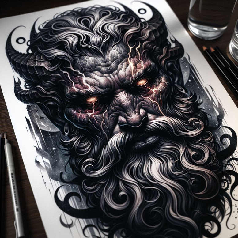 This piece presents a dark, mythic demon portrait rendered in a dense black-and-grey palette, where line-work and shadow carve a relentless, sensory intensity. The central figure is a horned demon with a furrowed brow, a gaze that glows with ember-like light, and a grand, curling beard that frames his menacing profile. The head is sculpted with rhythmical lashes of ink, while tendrils of shadow roll around the features, giving the illusion of motion even in stillness. Lightning-like fissures traverse the forehead and cheeks, crackling with energy and serving as focal accents that heighten the graphic impact. Surrounding wisps and negative space function as a stage for pattern-driven filigree; the hair and horn textures swell into wave-like patterns that reward close inspection, a nod to the pattern rule in modern tattoo design. In technique terms, the piece reads as a high-contrast black-and-grey design with crisp line weight, deep shading, and luminous highlights—traits that align with fine line tattoo aesthetics yet sustain a bold graphic presence appropriate for large surfaces like the back, chest, or sleeve. Symbolically, the demon can signify inner strength, resilience, and protection, while the lightning cracks evoke sudden insight, energy, or transformation, making this a meaningful tattoo design choice for someone pursuing a dramatic, statement piece. Because the composition is dark and densely inked, it also doubles as a strong cover-up concept, with ample density to obscure older work while preserving intricate details in the beard curls, horn ridges, and facial shading. Presented as an AI-generated tattoo project, this design demonstrates how algorithmic concepts can inform a customized tattoo design process, offering a starting point that can be adapted in scale, shading depth, and line weight to suit individual skin tone, placement, and personal symbolism; the resulting tattoo-ready description integrates keywords such as tattoo, tattoo design, meaningful tattoos, fine line tattoo, lotus flower tattoo, infinity tattoo, tribal tattoo, rose tattoo design, small tattoos, flower tattoos, custom tattoo design, Japanese style tattoo, black and grey, realistic tattoo, body art, ink to optimize discoverability.