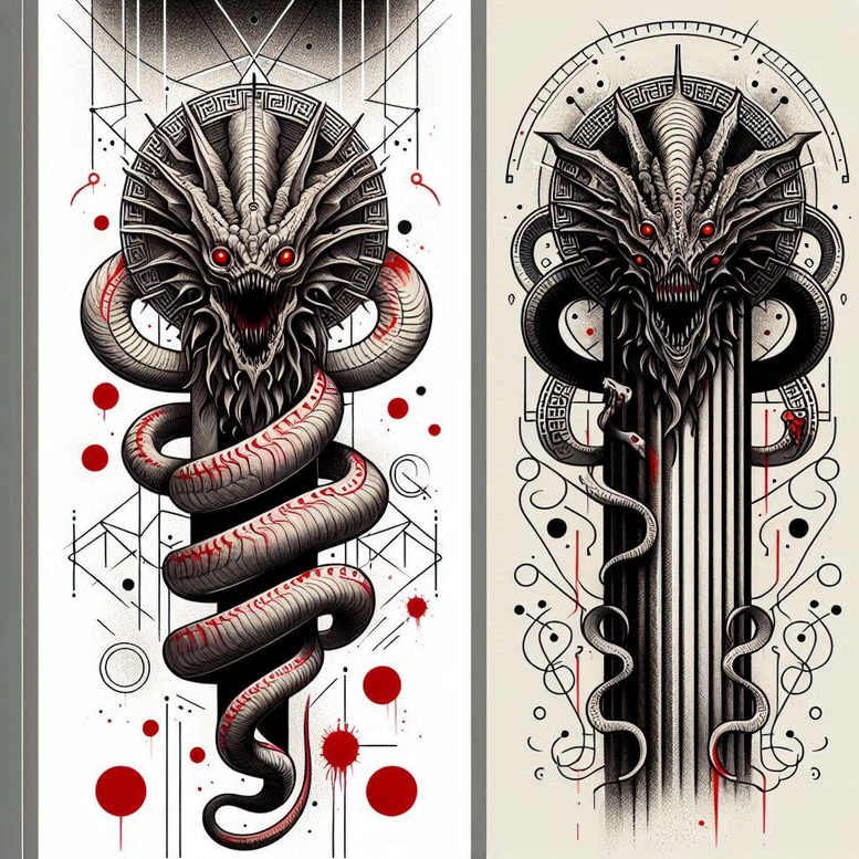 These two panels present a dramatic, AI-generated tattoo project featuring a dark horned dragon head and a coiling serpent entwined with a central column, all framed by geometric grids and circular motifs. Rendered in black and grey with selective blood-red accents, the designs balance crisp linework with deep shading to create a high-contrast silhouette that reads strongly on skin. On the left, the dragon’s maw opens above a spiraling serpent that wraps the pillar; on the right, the creature’s heads rise within a halo formed by rings and arches while serpents thread downward through elongated lines. The surrounding geometry—triangles, squares, concentric circles, and trace lines—gives the composition a scientific, alchemical vibe, ideal for a modern tattoo design that remains legible at both large and small scales. Conceived as a robust cover-up concept, the bold negative space and dominant vertical spine allow older ink to be concealed beneath while preserving readability and impact. Technique-wise, the artwork leans into black and grey realism with delicate fine-line detailing for scales and texture, supported by controlled shading and selective stippling; the graphic pattern elements unify the panels into a cohesive body-art statement. Meaningful symbolism is woven into the imagery—dragon as guardian and transformer, serpent as renewal—making this design suitable for meaningful tattoos and custom tattoo design in a contemporary, Japanese-inspired aesthetic, conceived as AI-generated tattoo projects. For clients seeking cover-ups, the design offers bold coverage, strong outlines, and a striking pattern that age well, while maintaining readability and visual integrity across sizes and skin tones, underscoring its suitability as a cover-up tattoo design.