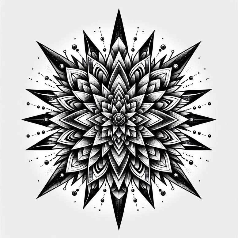 AI-generated tattoo project: this mandala-inspired design presents a dense, symmetrical starburst built from layered petals and sharp triangular spikes radiating from a central core. Executed in a fine line approach, the piece relies on crisp black ink and varied line weight to create depth, texture, and a luminous contrast that reads as black and grey on skin. The composition centers on a ringed circle, with concentric layers of teardrop petals that radiate outward, each tier mirroring the previous while increasing in complexity, producing a hypnotic pattern suitable for a large canvas. Tiny dots and radiating points around the edge add kinetic energy without overcrowding the core, helping readability when scaled. Technically, the design emphasizes steady linework, precise spacing, and controlled shading to preserve clarity on real skin; its bold silhouette makes it an excellent candidate for a cover-up, capable of masking older ink beneath a dense black field. While rooted in geometric discipline, the motif also fits contemporary tattoo trends, aligning with black and grey realism and fine line tattoo aesthetics, and it can be adapted to placements from shoulder to forearm. The pattern invites interpretation: a symbol of balance, renewal, and mindfulness, appealing to meaningful tattoos and flower-themed ideas for personal emblems. As an AI-generated tattoo project, it demonstrates how algorithmic design can inform professional ink work, offering a versatile template for custom tattoo design, pattern-focused body art, and bold visual statements in black and grey ink. The design complements lotus flower tattoo ideas and infinity tattoo aesthetics within a geometric vocabulary, remains suitable for small tattoos or larger sleeves, and nods to Japanese style tattoo influences while staying accessible as a modern, realistic black and grey body art template.