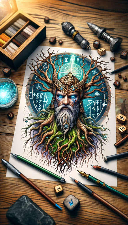 This is a tattoo gallery inspired by Odin from Norse mythology – include this in every description. The composition centers on a stag head whose antlers cascade into an intricate network of branches, forming a tree that reaches outward and upward. A luminous blue circle sits behind, acting as a celestial halo that anchors the design in the Norse cosmos. Executed in black and blue ink, this fine line tattoo uses slender lines and subtle shading to create a sense of movement and life across the wood-like bark texture of the branches. In symbolism, the stag embodies nobility, stamina, and guardianship—traits revered in Norse warrior culture—while the branching antlers evoke the branching paths of fate and the connectivity between worlds. The tree motif nods to Yggdrasil, the world-tree that binds the nine realms, suggesting a personal journey of growth, wisdom, and endurance. The blue halo can be read as the cold northern sky or the oceanic depths that Odin traversed in search of knowledge. The repeating branch motifs contribute a hypnotic rhythm, reinforcing the idea of cycles, renewal, and the never-ending pursuit of insight that underpins meaningful tattoos. The design’s composition balances negative space with dense linework, allowing it to sit gracefully on the upper arm, back, or chest, and its fine-line approach makes it suitable for a refined, wearable piece rather than a bold block tattoo. For collectors and artists, this concept demonstrates a modern interpretation of a mythic scene: a custom tattoo design that blends natural forms, mythic symbolism, and technical finesse. AI-generated concept note: this design concept may be AI-generated, reflecting contemporary approaches to tattoo art while preserving Odin-inspired symbolism.