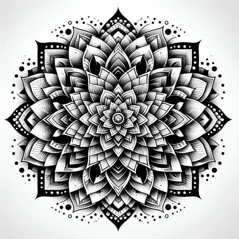 Black and grey mandala flower tattoo design rendered with meticulous linework and controlled shading, this piece balances precise geometry with the organic curvature of petals to create a compelling body art motif. The central rosette expands into many concentric layers of teardrop-shaped leaves and pointed petals, each level carved with fine lines, cross-hatching, and subtle stippling that build depth while preserving crisp black ink on skin. The outer circle is peppered with dots and small arcs that form a delicate halo, while bolder corner motifs anchor the composition and guide the eye toward the center. The overall effect is a dense, high-contrast pattern that remains readable at both small and large scales, making it suitable for forearm, back, or chest placement. The technique emphasizes precision in line weight, smooth black-to-grey gradient transitions, and even shading across repeating elements, hallmarks of a refined fine line tattoo and pattern-driven design. Symbolically, mandalas symbolize balance and unity; paired with petals they evoke growth, renewal, and the cyclical nature of life, offering a personal meaning for the wearer. For clients seeking a strong visual statement, this design can work as a standalone piece or as a cover-up option where existing ink is dense and dark. Its dense black shading, layered petals, and pattern-rich composition make it an ideal candidate for a cover-up that preserves symbolism while effectively masking prior tattooed areas. AI-generated tattoo projects like this one demonstrate how generative tools can inspire bold geometry and floral motif combinations while maintaining traditional tattoo aesthetics; the result is a versatile design that can be adapted to Japanese style tattoo, black and grey, realistic tattoo, and fine line contexts, or reimagined as lotus flower tattoo, infinity tattoo, tribal tattoo, or rose tattoo design. It suits small tattoos or larger body art installations, and invites customization, making it a meaningful tattoo choice for those seeking a timeless pattern-driven piece.