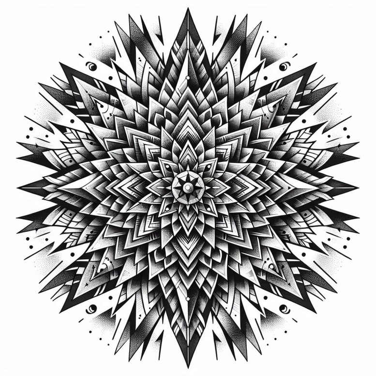 AI-generated tattoo project presents a radial mandala starburst in black and grey, etched in precise fine line technique. The design unfolds from a compact central motif into expanding rings of interlocking triangles and diamond shapes that radiate with controlled energy. Each blade is built from crisp lines and subtle shading, producing texture without losing legibility, a hallmark of fine line tattoo and black and grey ink. The core anchors the composition, while successive tiers introduce rhythm, balance, and sacred geometry-inspired symmetry. Negative space around the geometry intensifies contrast, allowing the dense geometry to read clearly on skin and scale gracefully from small to large pieces. Micro-dots around the perimeter function as decorative punctuation, guiding the eye outward and adding a quiet breath of movement. Symbolically, mandalas embody cycles, unity, and inner focus, making this design meaningful for tattoos that mark transformation or spiritual intention. The pattern-heavy arrangement invites flexible interpretations—from geometric compass to abstract flower motifs—so it can be placed on the arm, back, chest, or calf, and can be adapted to cover-up over older ink thanks to strong line work and strategic negative space. While it leans on Japanese-style line discipline, the piece remains a contemporary geometry piece suitable for a modern body art collection. For clients and artists, the project demonstrates how a dense, high-contrast motif translates across sizes without losing crispness, ideal for both small tattoos and larger pieces, and it stands up to ink saturation with robust line integrity. If the goal is a cover-up, this design excels, offering solid coverage and a bold silhouette while preserving detail and readability over time. In short, this tattoo design embodies precision, versatility, and meaning, aligning with trends in fine line, black and grey, and geometric tattoos, making it an excellent candidate for a custom tattoo design.