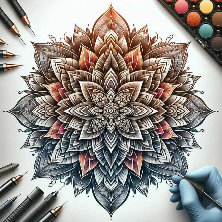 This image presents a mandala-inspired tattoo concept executed in a crisp fine-line style, a complex lattice of petals radiating from a central medallion. The design relies on meticulous linework, subtle dot shading and graded grey tones to build depth across dozens of nested layers, producing a sense of organic symmetry that reads as both meditative and dynamic. Each petal is carved with a sequence of feathered veins and micro-patterns that invite a closer look, while the central motif anchors the composition with a circular ornament that hints at mandala symbolism, balance, and eternity. The surrounding negative space helps the linework breathe, making the overall piece suitable for various placements on the body, including forearms, shoulders, or back. The color palette remains in black and grey, with gradations and stippling creating atmosphere rather than bold solid fills, reinforcing the fine-line aesthetic and ensuring longevity on skin. This ornamental design reads as a single cohesive tattoo design rather than a collage of parts; the pattern-rich structure supports a rhythm and movement around the central core, which makes it appealing for personal meaning as well as aesthetic appeal. The image captures a moment of design development, with visible drawing tools such as pens, pencils, and a color palette suggesting the craft of tattoo art as a discipline. For clients seeking meaningful tattoos, mandalas commonly symbolize unity and harmony, while the intricate pattern work makes it suitable for both smaller pieces and extended sleeves in the black-and-grey spectrum. The piece demonstrates how a highly detailed geometric floral concept can be translated into a practical tattoo design: the fine-line technique preserves delicate line integrity and longevity, and the layered petals offer options for light shading or more pronounced texture. Presented here as an AI-generated tattoo project, the artwork reflects contemporary methods of concept visualization in body art and can inspire studios to adapt the pattern into a custom design with variations in scale, placement, and line density. Keywords to consider include tattoo, tattoo design, meaningful tattoos, fine line tattoo, lotus flower tattoo, infinity tattoo, tribal tattoo, rose tattoo design, small tattoos, flower tattoos, custom tattoo design, Japanese style tattoo, black and grey, realistic tattoo, body art, ink.