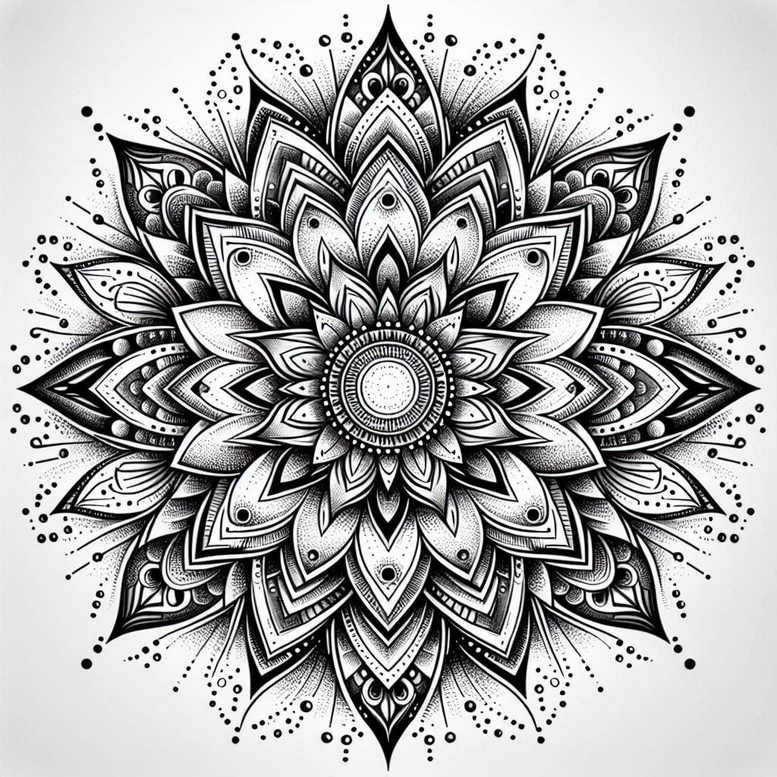 AI-generated, this mandala tattoo design explores a dense, radial motif built from concentric rings of petals, each layered with precise fine lines and subtle dotwork. The central circle anchors the composition as a meditative focal point, while outwardly radiating teardrop shapes and crescents unfold in symmetry, creating a pattern-rich tapestry that rewards close inspection. The technique relies on meticulous line work, stippling, and controlled shading to imply depth without color, yielding a striking black and grey piece whose drama comes from contrast and texture rather than hue. Because of its intricate palette of interlocking forms, the design reads well at both small and large scales, making it suitable for a standalone piece or as a cover-up over earlier tattoos where darker inks require careful masking. As an AI-generated tattoo project, this study demonstrates how mandala geometry translates across skin textures and placement, whether used as a full-shoulder statement, a back-panel centerpiece, or a wrist-sized tribute. Symbolically, mandalas evoke balance, unity, and renewal, with each ring suggesting growth toward a center that represents the self; the dense detailing in this rendering emphasizes mindfulness and permanence through time, appealing to fans of traditional black and grey ink, fine line tattoo, flower tattoos, and custom tattoo design. The piece also nods to broader trends such as geometric and Japanese-inspired motifs through its precise symmetry and crisp negative space, while the dot shading provides atmospheric shading that remains legible as the tattoo ages. For clients seeking a meaningful tattoo design that doubles as a bold cover-up, this mandala study offers a timeless, versatile option that pairs well with future expansions or complementary motifs like lotus or infinity, ensuring a harmonious body art statement. Careful planning of line weight ensures durability on skin, with outer edges kept crisp by deliberate spacing and micro-dot shading that minimizes blurring over time. The geometry invites adaptation: smaller versions preserve the integrity of the design, while larger panels allow for more breathing room and added shading variation. The request for a custom tattoo design that merges meditative symbolism with contemporary line-work makes this piece a versatile template for studios seeking portfolio-worthy work. The overall effect remains legible at a distance, yet reveals intricate micro-patterns up close, a hallmark of high-level black and grey mandala tattoos. In sum, this design embodies the convergence of tradition and modern technique, delivering a timeless tattoo design that stands up to the test of time and ink aging, while offering optimum cover-up potential.