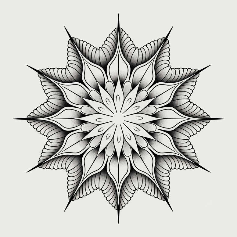 An AI-generated tattoo project presenting a mandala flower design executed in black and grey linework. The composition unfolds as a circular array of layered petals, with elongated teardrop shapes radiating into sharp star points. Crisp outlines and smooth grey gradients create depth without solid fills, while subtle stippling adds texture along the petal edges. The symmetrical arrangement guides the eye from a restrained central core to the outer rings, a classic pattern-driven approach that embodies balance and rhythm. Symbolism leans on the mandala’s meaning of unity and growth, with the lotus flower tattoo symbolism appearing in the petals, suggesting purity and renewal, and the outward spikes signaling radiance and protection. Technically, this piece showcases fine line tattoo technique: clean line precision, even spacing, and careful shading to preserve legibility on both small canvases and larger areas. As a versatile tattoo design, it can function as a standalone focal point on the shoulder, chest, or forearm, or serve as a scalable foundation for a larger sleeve with additional motifs. The image is well-suited for a cover-up when placed over darker existing work, because its dense geometry and negative space can be reworked with fresh black ink. Note that this is an AI-generated tattoo project, reflecting how digital design tools translate into timeless body art concepts. For practitioners and clients alike, the piece offers a refined pattern-driven template that aligns with modern floral tattoo design, Japanese-style influences, and black and grey ink aesthetics while remaining adaptable to customization and personal symbolism. The design also invites adaptation into infinity tattoo concepts and rose tattoo design crossovers, and can easily function as a custom tattoo design. In short, this tattoo design intertwines pattern, form, and meaning to deliver a precise, elegant statement in black and grey ink, suitable for both small tattoos and more expansive body art.