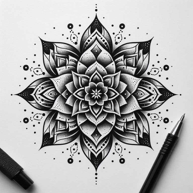 AI-generated mandala tattoo design features a centered lotus-like bloom built from layered petals and precise geometric patterns. The composition unfolds in concentric rings: a detailed inner flower, followed by overlapping pointed petals, then larger outer layers, all connected by a lattice of fine lines. Each petal is rendered with crisp outlines and stippled shading that creates subtle gradient and depth in black and grey, while solid black fills anchor the design and give it dramatic contrast. Dots, small crescents, and teardrop motifs punctuate the perimeter, producing a radiant aura that reads as a ceremonial mandala. The overall symmetry is exact, with mirrored elements on all axes, making it a banquet of pattern that can adapt to a range of placements—from forearm to back. This tattoo project is clearly a study in pattern and linework, designed to function as a stand-alone piece or as a cover-up if needed, thanks to its dense shading and large negative spaces that can be leveraged to obscure prior tattoos. The design nods to traditional mandala symbolism, implying balance, unity, and spiritual journey, while remaining versatile enough for modern interpretations in black and grey ink. In practice, the piece relies on a mix of fine line work, dotwork, and bold segments to ensure legibility over time and aging gracefully with minimal color. The AI-generated origin is acknowledged here, highlighting its utility as a precise starting point for a client seeking a meaningful tattoo design that emphasizes refinement, geometry, and meditative symbolism. Keywords woven throughout include tattoo, tattoo design, meaningful tattoos, fine line tattoo, lotus flower tattoo, infinity tattoo, tribal tattoo, rose tattoo design, small tattoos, flower tattoos, custom tattoo design, Japanese style tattoo, black and grey, realistic tattoo, body art, and ink. When completed on skin, the pattern-heavy mandala offers opportunities to customize line weights, spacing, and surrounding elements to tailor the piece to an individual body contour, while maintaining the integrity of the pattern.