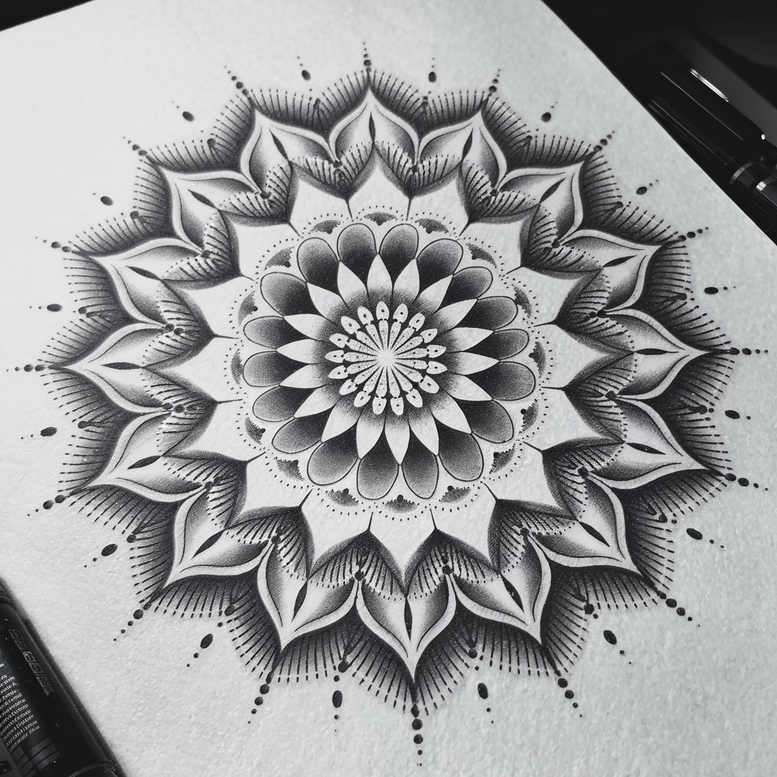 This AI-generated tattoo project presents an intricate black-and-grey mandala composed of concentric rings of petals, delicate line work, and selective dot shading. The central motif radiates symmetry and a calm, meditative energy, with each ring building a floral geometry that draws the eye toward the heart of the design. Fine line techniques define the slender petals, while stippling adds texture and depth, creating a soft gradient from the dense inner cores to the more airy outer layers. The outer perimeter features pointed petals edged with bold, clean contours and subtle negative space that enhances legibility when transferred to skin. The design relies on precise spacing and balance, making it adaptable for small placements like the wrist or ankle, or as a larger piece on the back, shoulder, or forearm. In terms of meaning, mandalas symbolize harmony, wholeness, and the cosmos, and this version emphasizes cyclical growth through repeating motifs and radial symmetry. The piece also pairs well with other tattoo concepts such as lotus flower tattoos or tribal elements, offering a strong base for a custom tattoo design or for integration into Japanese-style tattoo aesthetics, while staying firmly in the black-and-grey palette that suits elegant body art and inked line-work. This concept is an AI-generated tattoo project, intended as a reference for artists seeking a high-contrast, pattern-rich mandala that can be tailored with touch-ups, color accents, or scale adjustments, and it demonstrates how fine line tattoo techniques and dotwork can combine to create a timeless, meaningful tattoo design that appeals to fans of small tattoos as well as larger, more detailed pieces.