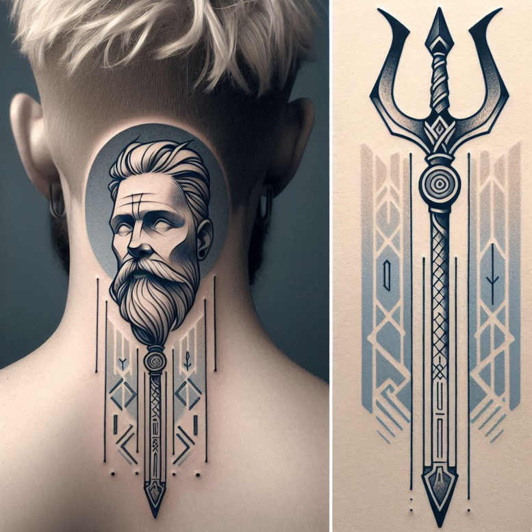 This Odin-inspired tattoo design fuses a lifelike portrait of the god Odin with a disciplined column of geometric runic motifs that descend along the wearer’s spine. Rendered in black and grey, the portrait employs subtle gradations, chiaroscuro shading, and meticulous line work to convey Odin’s stern expression, age, and a venerable beard, while the central axis is anchored by a stylized spear motif reminiscent of Gungnir. Flanking panels on the right introduce a tall, trident-like spear with inlaid geometric shapes and repeating ornaments, creating a bold rhythm that balances the realism of the head with graphic abstraction in metal-toned blocks. The runic bands and vertical arrangements evoke ancient Norse symbolism, offering protective meaning and a sense of navigating fate, knowledge, and war. The design invites reflection on wisdom, sacrifice, and mastery—characteristics associated with Odin—and the beads or lines running along the neck resemble a talismanic corridor, guiding the viewer’s eye along the spine. From a tattoo design perspective, the composition demonstrates how black and grey ink can achieve depth and texture at large scales, with contrast built through negative space and dense black shadows. The resulting imagery reads as both mythic portrait and modern tattoo, suitable for meaningful tattoos and as a bold body art statement. Because the overall piece relies heavily on deep blacks and solid silhouettes, the concept is perfectly suited for cover-up, making it an attractive option for those seeking to rework existing ink while embracing a mythic Odin motif. This concept may be AI-generated as part of an explorative gallery, illustrating how traditional Norse symbolism can be fused with contemporary geometry to produce powerful tattoo designs.