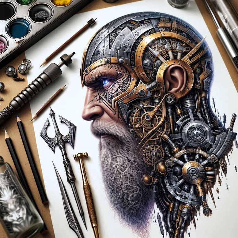 Odin-inspired cybernetic portrait merges myth and machine in a bold, high-contrast composition. The central figure is Odin, rendered as a weathered head where flesh meets chrome, with gears, pistons, and cables forming the skull and jaw. The shading uses deep Blacks and cool greys to establish a black and grey aesthetic that heightens volume and texture while maintaining clarity in linework. Surrounding machinery threads weave into the portrait, creating a repeating pattern of cog spokes, threaded rivets, and wire filaments that adds rhythm and cohesion to the piece. Symbolically, Odin the Allfather stands for wisdom, sacrifice, and the relentless pursuit of knowledge; runic glyphs along the temple suggest protection and magical insight, while angular motifs allude to Odin’s quest for power and foresight. Subtle references to Huginn and Muninn—the ravens of memory and thought—emerge as wing-like shapes and watchful eyes integrated into the composition, inviting interpretation about memory, guidance, and fate. The design leans into a modern fantasy-steampunk vocabulary, balancing realism and mechanical surrealism to suit large-scale canvases or as a dramatic half-sleeve insert. For tattoo lovers seeking meaning, this piece encodes the aspirational ideal of knowledge through sacrifice, the tension between mythic authority and industrial craft, and the ancient symbol’s timeless resonance in a contemporary body art context. The fine line details permit intricate engraving, while bold silhouettes ensure readability over time, making it a strong candidate for a cover-up where previous tattoos must be obscured by a unified, story-driven image. The concept’s AI-generated origin occasionally surfaces as a nod to contemporary design processes, yet the reference to Odin remains faithful to mythic symbolism, combining crown-of-gear iconography with rune-laced surfaces to produce a striking, personal tattoo design that can carry meaningful tattoos into the future. The presence of repeated mechanical motifs—gears, spokes, and riveted plates—creates a pattern-like texture that reinforces unity across the piece, while the overall composition preserves a clear focal point on Odin’s face, ensuring it reads as a powerful, meaningful tattoo that resonates with enthusiasts of black and grey realism and myth-inspired ink.