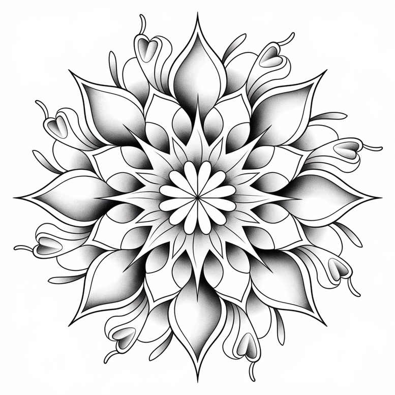 An intricate mandala flower tattoo design rendered in fine-line black and grey, this pattern-rich composition centers on a geometric bloom built from nested petals that radiate outward in symmetrical layers. The core features a compact ring of teardrop shapes, followed by a sequence of pointed petals that morph into larger, leaf-like forms; delicate shading creates a subtle gradient from solid black to pale grey, enhancing depth while preserving a clean linework aesthetic. The design relies on negative space and precise line weight to achieve a hypnotic, meditative rhythm typical of mandala motifs. Visually dominant elements include the central circular motif, concentric petal layers, and outer appendages that curve and loop, giving a sense of motion while remaining perfectly balanced. As a pattern-driven tattoo, it invites variations: smaller versions can compress the scale for tiny tattoos, while expanding lines can fill a sleeve with a cohesive motif. While this is a standalone tattoo idea, its uniform geometry makes it an ideal candidate for a larger piece, a cover-up, or a detailed sleeve insert for someone seeking a sophisticated pattern-based composition. The symbolism of mandalas—unity, balance, and inner harmony—complements meaningful tattoos such as a lotus flower tattoo, infinity tattoo, or rose tattoo design, and it nods to Japanese-style tattoo principles with careful line control and a restrained black-and-grey palette. The technique emphasizes crisp contour lines, smooth shading, and clean gradient transitions that translate well into tattoo design reproductions, digital transfers, or custom tattoo design consultations. It works as a small tattoo, a back piece element, or a central focal point within a larger body of ink, embodying versatility, longevity, and classic body art value. As an AI-generated tattoo project, it demonstrates how algorithmic design can produce high-precision linework that resonates with meaning, style, and craft in modern tattoo culture.