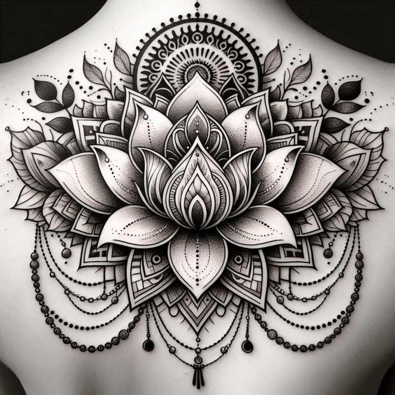 This AI-generated tattoo project presents a large chest piece centered on a lotus mandala, rendered in black and grey with meticulous line work, stippling, and ornamental chains. The composition blends a symmetric lotus blossom at the focal point with multiple layers of petals radiating outward, interlaced with mandala-inspired geometric patterns and delicate dotwork. Around the bloom, looping strands of beads cascade in curved arcs, adding a sense of movement and depth that anchors the design to the body. The fine line technique yields crisp outlines and subtle shading, while feathered gradients create a sense of dimensionality without solid blocks of black. The overall silhouette is broad and intricate, making it a statement piece suitable for upper chest or sternum areas. Symbolically, lotus represents purity and awakening, while the mandala conveys balance and mindfulness; the bead chains introduce a sense of jewelry-like ornamentation, suggesting a personal narrative of growth and connection. The design is well-suited for a cover-up due to its dense black shading and complex linework, which can elegantly obscure older tattoos while integrating existing skin texture. As an AI-generated tattoo project, it offers an advanced reference for artists seeking a highly structured, pattern-rich motif that can be adapted in scale or detail. In terms of style, the piece sits firmly in black and grey, with fine line precision and a pattern-led composition that invites variations, from a smaller, minimalist version to a full-coverage chest piece. For those exploring meaningful tattoos, this lotus flower tattoo design embodies serenity and resilience, while the geometric mandala adds a timeless, universal appeal; it also demonstrates how Japanese-inspired motifs can merge with modern dotwork and ornamental chains to create a contemporary body art statement. This description highlights both technical execution and symbolic resonance, ensuring visibility in searches for tattoo design, meaningful tattoos, fine line tattoo, lotus flower tattoo, infinity tattoo, tribal tattoo, rose tattoo design, small tattoos, flower tattoos, custom tattoo design, Japanese style tattoo, black and grey, realistic tattoo, body art, ink.