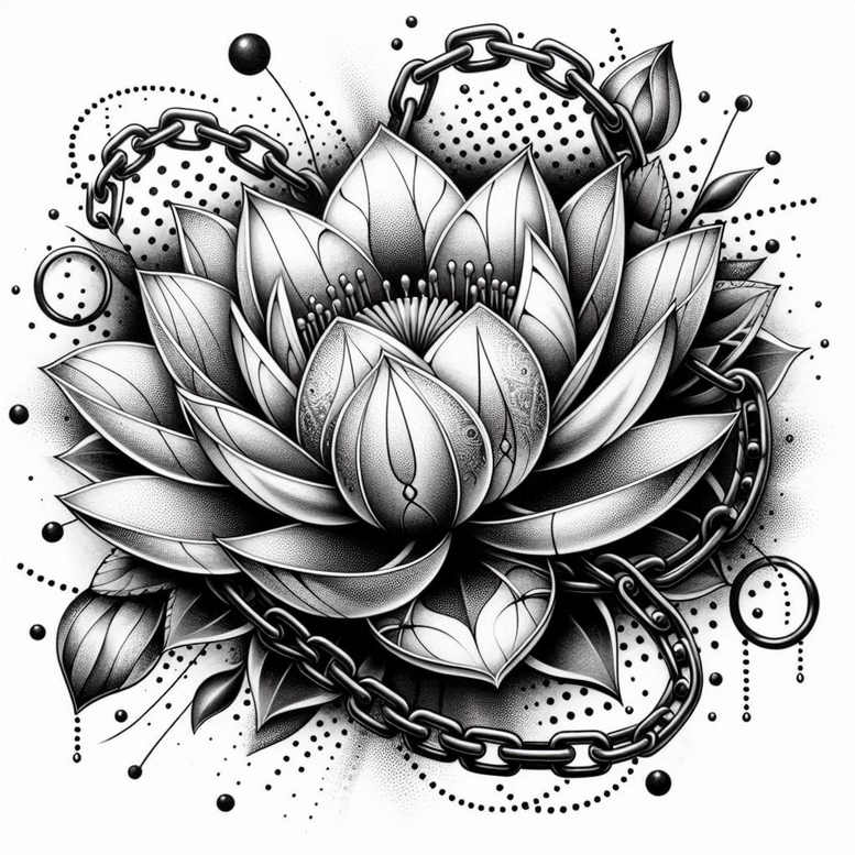 These AI-generated tattoo projects explore intricate linework and shading, and this description reflects a lotus-and-chain concept designed for both stand-alone display and cover-up potential. The composition centers a blooming lotus rendered in black and grey, entwined by a bold chain motif that wraps and loops around the flower’s roots and petals. The design blends precise linework with stippled shading and dotted halftone accents, forming a dynamic graphic pattern that adds movement and texture to a classic botanical subject. The lotus is upright and symmetrical, symbolizing purity, resilience, and growth, while the interlaced chain conveys strength, connection, and endurance—an evocative pairing for a meaningful tattoo design. The surrounding negative space and gradual grey scale create depth and contrast, allowing the piece to read clearly at both close inspection and from a distance. Elements include the lotus blossom with layered petals, linked chain segments, circular rings, and scattered dotwork that radiates around the composition; this combination embraces a fine line tattoo aesthetic while preserving a bold black and grey presence suitable for body art. While the work uses a modern, graphic approach, it also nods to traditional Japanese and tribal tattoo sensibilities through disciplined linework and symbolic motifs, making it adaptable for small tattoos or larger sleeve concepts. The piece is particularly suitable for a cover-up due to dense black areas and strong silhouettes capable of concealing older ink beneath; artists can adjust scale, line weight, and shading to fit skin tone and prior work. In the broader context of tattoo design, this lotus-and-chain concept speaks to meaningful tattoos that pair natural imagery with personal symbolism, aligning with keywords like lotus flower tattoo, black and grey ink, fine line tattoo, rose tattoo design, custom tattoo design, and ink. As an AI-generated concept, it provides a realistic reference point for tattoo artists seeking to translate graphic patterns into permanent body art that remains legible and striking across sizes and applications.