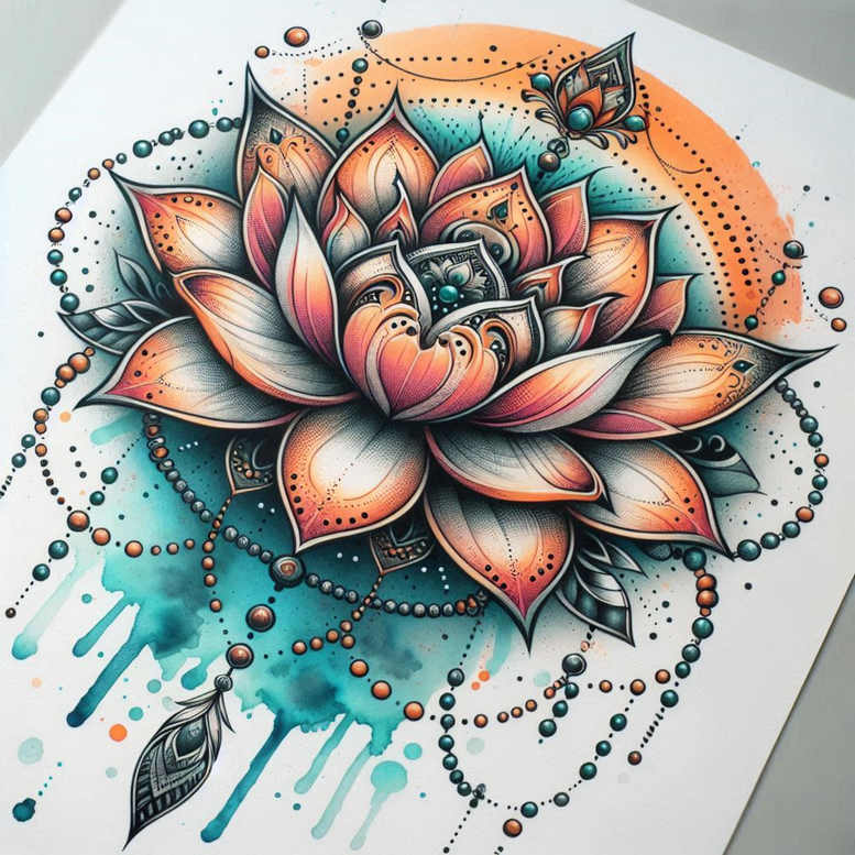 This is an AI-generated tattoo project concept showcasing a vibrant lotus bloom rendered with bold outlines and watercolor shading. The central lotus sits in a multi-layered rosette of petals colored in warm orange and cool teal, with precise black linework defining each edge and subtle stippling for depth. A cascading bead chain travels along the periphery, interlacing with circular motifs and dots that echo a jewelry motif and mandala-inspired geometry. The watercolor wash bleeds beyond the outlines, creating a vivid, dynamic background of teal splashes and orange accents that enhance motion and energy across the composition. The piece blends traditional floral tattoo design with contemporary watercolor techniques, achieving a balance between crisp linework and fluid color that remains legible on both small and larger canvases. The lotus carries symbolism of purity, spiritual awakening, and resilience, while the bead strands suggest continuity and connection; together they form a narrative of growth and endurance. The arrangement leans into patterns found in geometric and mandala art, with repeating circular motifs and dotted lines that introduce rhythm and texture, yet it preserves readability when scaled. The design echoes Japanese style tattoo sensibilities through disciplined spacing, clean curves, and an emphasis on symmetry, while staying accessible to custom tattoo design workflows for clients seeking meaningful tattoos. As a color-forward concept, this AI-generated project thrives on contrasts between orange, teal, and black ink, offering a vivid palette that stands out on light or dark skin tones and ages gracefully with minimal blur. The description intentionally foregrounds ink, linework, and shading strategies suitable for a tattoo studio portfolio; it also speaks to the evolving landscape of tattoo art, where digital generation informs traditional practice. Readers will find in the motifs a blend of lotus symbolism, floral aesthetics, and ornamental beadwork that resonates with themes of growth, balance, and beauty—an adaptable design for those exploring small tattoos or larger sleeves, with potential for pattern expansion in ongoing body art projects.