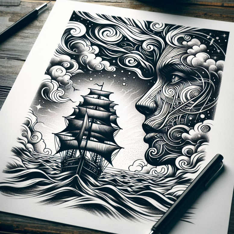Odin-inspired tattoo design that merges a profile portrait of Odin with a sailing longship and rolling ocean waves. The composition uses swirling knotwork that transitions from the beard and hair into the rigging and foam, creating a unified silhouette that reads as both mythic portrait and voyage scene. Rendered in black and grey realism, the piece employs strong chiaroscuro: deep blacks carve the eye socket and jaw, midtones reveal hair detail and knotwork, and gradual greys articulate the ship’s hull, rigging, and waves, preserving legibility on large canvases and ensuring a timeless look on the skin. Symbolically, Odin—the Allfather of Norse mythology—embodies wisdom, magic, and sacrifice for knowledge; the longship signifies journey, fate, and the wanderer’s path, while the knotwork expresses interwoven destinies and protection. The repeating geometric patterns echo ancient Norse art and modern tattoo design, giving the artwork a sense of rhythm and continuity that complements both traditional and contemporary aesthetics. This concept is deliberately designed as a cover-up-friendly piece: the dense black regions and layered shading provide excellent opacity for concealing prior tattoos, and the strong negative space around the face ensures the image retains its recognizability. For tattoo enthusiasts seeking meaningful tattoos, this design blends mythic symbolism with nautical imagery, offering a striking statement piece suitable for forearms, chests, or backs. As an AI-generated concept, it presents a compelling starting point for a custom tattoo design, inviting refinement in consultation to tailor line weight, scale, and placement to individual anatomy and skin tone. The final ink would carry the same core motifs—Odin’s profile, a longship, rolling sea, and knotwork—while honoring the wearer’s personal story and aesthetic preferences, ensuring a timeless piece within the canon of black and grey body art and ink. The grayscale palette keeps the design versatile across skin tones and aging, while adjustable line weight and stippling can introduce texture. The repeating knotwork provides rhythm and pattern without overpowering the portrait, making it suitable for a back piece or a bold sleeve where the ship and waves can wrap around a limb. The concept respects traditional Norse symbolism and translates it into a contemporary tattoo design language that supports meaningful tattoos for those drawn to myth, sea, and destiny. Note that this is an AI-generated concept intended as a starting point for a custom tattoo design, encouraging collaboration with an artist to tailor symbolism, scale, and placement to individual preferences while preserving the epic mood and dignified silhouette that Odin embodies.