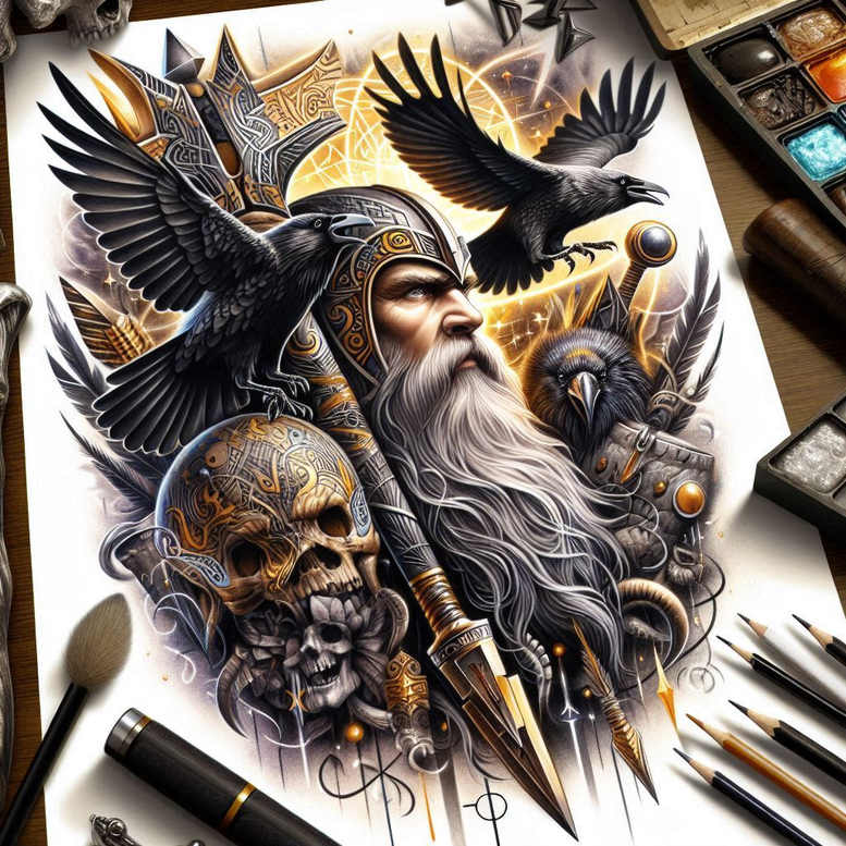 This Odin-inspired tattoo design in color creates a cinematic, mythic scene anchored by the one-eyed Allfather. A rugged Odinson figure gazes outward while two ravens wheel above in a stark, lifelike render, their wings curving to guide the eye toward a weathered skull at the foreground and a long spear that crosses the composition. The piece relies on dense black shading and fine line work to build depth, with subtle earth tones and restrained metallic highlights that prevent the image from feeling flat. The bearded visage is sculpted with smooth transitions from shadow to light, while the ravens’ feathers are rendered in meticulous layering to suggest movement and texture. Symbolically, Odin represents wisdom, fate and magic; Huginn and Muninn embody memory and thought, always watching; the skull stands as a reminder of mortality and the costs of knowledge; and the spear alludes to Gungnir, Odin’s weapon of sovereignty and strategic power. The design merges traditional Norse iconography with contemporary tattoo aesthetics, offering a bold silhouette that remains legible at larger scales and retains intricate details on the skin. The piece is particularly suited for a cover-up thanks to its high-contrast areas and deliberate dark blocks that can be integrated with existing ink; its dense composition also invites adaptation into back-piece or chest-panel layouts. This AI-generated concept explores a conversation between mortality and wisdom, inviting the wearer to contemplate meaning, courage and the transformative power of ink. For SEO, keywords such as tattoo, tattoo design, meaningful tattoos, Norse, Odin, black and grey, color, custom tattoo design are woven seamlessly, ensuring the design appeals to collectors of mythic body art and devotees of modern Norse art.