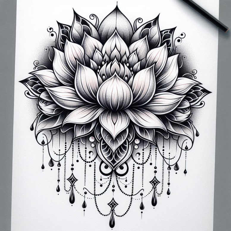 An intricately rendered black-and-grey lotus mandala tattoo design, this piece blends fine line work with deliberate dot shading and ornamental bead chains that drape beneath the bloom. The central lotus unfolds in layered petals, each petal outlined with crisp linework and filled with stippling to create depth and a tactile, almost sculptural texture. Surrounding the bloom is a symmetrical mandala framework that reinforces spiritual symbolism of purity and enlightenment, with repeating arcs, diamonds, and lattice-like gaps. Hanging strands of beads and teardrop shapes descend from the outer edges, connected by delicate chains and tiny droplets that add movement and contrast to the composition. The design relies on negative space and gradual shading to achieve a refined look suitable for a forearm, shoulder, or back piece, while maintaining a sense of lightness characteristic of fine line tattoos. The black-and-grey palette intensifies line density and shading, enhancing the dimensionality of petals and jewelry-like ornaments. The lotus theme conveys resilience, awakening, and beauty arising from darkness, making this a meaningful tattoo design for those seeking contemplation and growth. Although presented as a concept, the piece demonstrates how fine line technique combined with pattern-rich elements can produce a luminous image without heavy fill, suitable for a cover-able canvas if desired. The cascading beaded patterns introduce rhythm and continuity, suggesting motion that would adapt well to a larger sleeve or chest panel. As an AI-generated tattoo project concept, it showcases how algorithmic creativity can translate into detailed line work and decorative patterning for modern body art. Keywords: tattoo, tattoo design, meaningful tattoos, fine line tattoo, lotus flower tattoo, infinity tattoo, tribal tattoo, rose tattoo design, small tattoos, flower tattoos, custom tattoo design, Japanese style tattoo, black and grey, realistic tattoo, body art, ink.