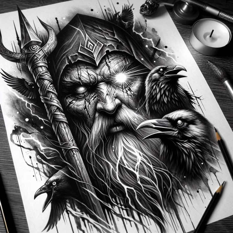 Odin-inspired black and grey portrait tattoo design in a dramatic, high-contrast composition. This Odin-inspired Norse mythology piece centers on the all-wise deity, Odin, rendered with a weathered face, a flowing beard, and a heavy horned helm, flanked by two ravens. Executed in bold black and grey realism, the shading builds solid form and a moody, timeless look, with crisp feather details that invite closer study. The central figure anchors the composition while atmospheric linework and subtle negative space create a sense of depth and gravity that suits large-scale placements. The ravens embody Huginn and Muninn, the gods’ messengers, representing thought, memory, and foresight, underscoring Odin’s relentless pursuit of knowledge. In Norse symbolism, these birds are a reminder of divine guidance and hidden wisdom, making this tattoo design meaningful for those who seek courage, insight, and personal mythologies expressed through ink. The piece is crafted to read in grayscale, with emphasis on contrast and texture rather than color, a hallmark of black and grey realism. This project concept embraces traditional motifs while translating them into contemporary ink aesthetics, and as an AI-generated concept it elegantly merges mythic symbolism with modern body art. For wearers, the dense blacks and precise linework contribute to a cover-up-friendly foundation, allowing scarring or old tattoos to be concealed effectively when placed over darker skin or larger areas. The overall mood is majestic and somber, inviting contemplation of Odin’s wisdom and sacrifices, and the composition supports legibility at multiple scales while preserving intricate details in close inspection. In summary, this Odin-inspired portrait is a powerful tattoo design for fans of Norse myth, designed with strong black and grey shading and a bold, timeless presence that reads as a meaningful tattoo in any portfolio.