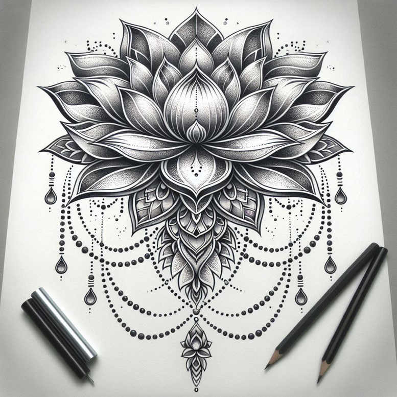 An intricate lotus and mandala composition dominates the sheet, rendered in pure black ink with grey shading that builds depth through delicate stippling and fine-line work. The central lotus is sculpted in multiple petal layers, each petal edged with crisp outlines and softly graded tints that give the piece a luminous, almost three-dimensional quality. Surrounding the bloom, geometric mandala petals radiate outward in perfect symmetry, creating a hypnotic pattern that draws the eye toward the core. Draped chains of beads and teardrop drops extend from the outer rings, like ornamental jewelry, lending a sense of movement and rhythm to an otherwise static design. The entire piece relies on restraint: a black-and-grey palette, meticulous line work, and strategic negative space that preserve clarity at both small and large scales. The result is a versatile tattoo design that can be adapted to various placements, from forearm to back, while maintaining readability and elegance as the size changes. This is presented as an AI-generated tattoo project intended to showcase how precise linework and pattern-driven composition can be translated into a wearable tattoo, with room for customization in bead spacing, line thickness, and overall density. Symbolically, the lotus represents purity and awakening, while the mandala evokes balance and wholeness; the beaded chains hint at interconnected journeys, a meaningful tattoo choice for those seeking growth, protection, or personal symbolism. From a technical perspective, the piece demonstrates skill in black-and-grey realism, sub-surface shading, and dot-work texture, offering a rich reference for tattoo artists pursuing fine-line design, rose and lotus motifs, or Japanese-inspired flower tattoos, yet firmly grounded in contemporary tattoo design aesthetics. In short, this concept blends traditional floral symbolism with modern pattern-making to create a striking, timeless tattoo design suitable for a dedicated collector of meaningful tattoos and small-to-medium body art. AI-generated concept applied for inspiration and client collaboration.
