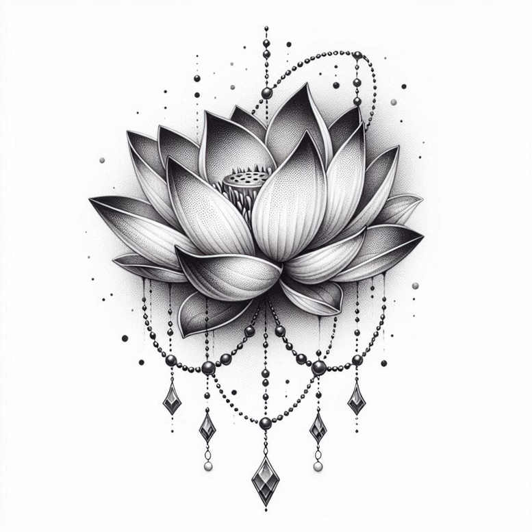 This is an AI-generated tattoo project that presents a single lotus in full bloom rendered in fine line black and grey ink. The petals are built with crisp lines and subtle dotwork shading, creating a sense of depth while keeping the image legible at small sizes. Surrounding the lotus are strings of beads that drape in graceful curves, with evenly spaced joints and tiny spheres that catch light in tonal shifts. Intersecting the bead strands are diamond-shaped pendants that hang with measured weight, giving a jewelry-like halo around the flower. The overall composition relies on deliberate negative space to keep the image airy, yet the dense cluster of petals remains the focal point. Central to the symbolism, the lotus represents purity, spiritual awakening, and resilience, while the bead chains evoke continuity, connection, and time’s passage; the diamonds bring facets of clarity and refinement. From a technique perspective, the design blends line work with stippling to create texture on the petals, bone-white highlights, and soft shadows beneath the bloom, all performed in black and grey to achieve a classic tattoo aesthetic. The piece lends itself to a custom tattoo design that can scale from a small forearm piece to a larger back or thigh composition, with clear legibility and strong contrast. If placed as a cover-up, the pattern of beads can help obscure prior ink while the lotus acts as a powerful new focal point; its ornamentation also allows adjustments in density without losing the design’s integrity. For collectors of meaningful tattoos, the lotus motif tied to jewelry-inspired detailing offers a timeless option that blends traditional symbolism with contemporary fine line technique, suitable for both floral tattoo design enthusiasts and lovers of sophisticated black and grey body art, with potential integration into Japanese-inspired or tribal-inspired themes as a personal interpretation of water, earth, and light in ink.