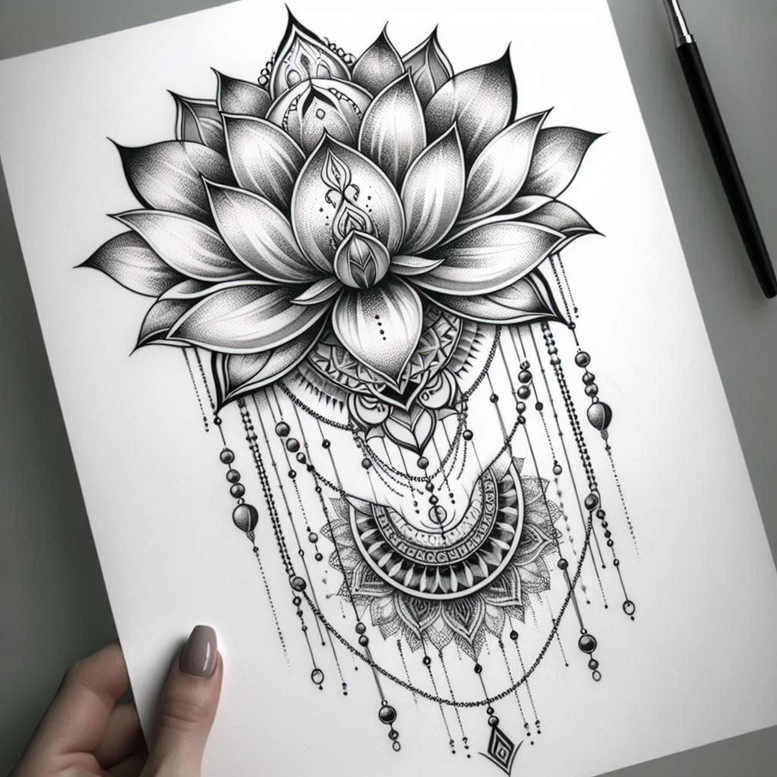 This is an AI-generated tattoo project featuring a black and grey lotus blossom crowned by a detailed mandala and cascading bead strings. Rendered in fine line and dotwork shading, the design blends bold outlines with subtle gradations to create depth on skin. The lotus sits above a layered mandala motif, with geometric crescents and arches echoing jewelry designs. Beads hang in slender strands, varying in size, creating rhythm and movement that wrap around the central flower. The composition relies on precise line weights and stippling to achieve texture, while negative space enhances contrast and readability across different body areas. The symbolism centers on purity, spiritual awakening, and protection, with the lotus representing the journey from darkness to light and the mandala signifying balance. The decorative drape evokes a sacred paraphernalia or jewelry-inspired motif, which helps integrate the tattoo into larger sleeves or back pieces. Technique-focused notes: clean line work, smooth shading, meticulous dotwork, and careful layering of mandala elements to maintain clarity as the piece scales. For clients considering a meaningful tattoo with strong visual impact, this pattern-rich design offers a sophisticated option that remains versatile for placement on the forearm, back, or calf. It also doubles as an excellent candidate for covering previous ink due to its dense black coverage and complex motifs; in such cases the larger dark areas effectively conceal underlying tattoos while preserving elegance. AI origin is intentionally highlighted to reflect current approaches to tattoo design, with motifs that invite personalization—substituting colors, modifying bead counts, or tweaking the flower’s orientation. Keywords woven into the narrative include tattoo, tattoo design, meaningful tattoos, fine line tattoo, lotus flower tattoo, infinity tattoo, tribal tattoo, rose tattoo design, small tattoos, flower tattoos, custom tattoo design, Japanese style tattoo, black and grey, realistic tattoo, body art, ink.