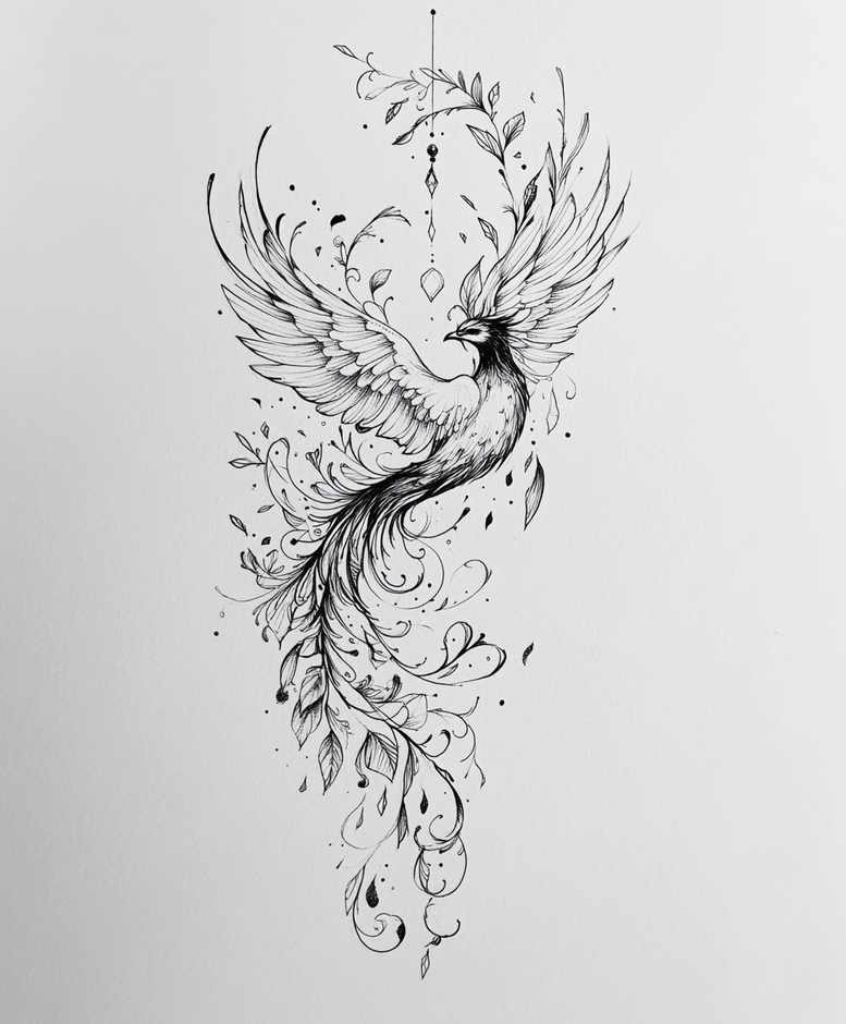 This elegant tattoo design presents a phoenix rendered in fine line black and grey ink, its wings spread in a sweeping arc and a long, flowing tail that dissolves into ornamental vines and curling tendrils. The main bird is drawn with crisp linework, delicate feather details, and a focused expression, while the surrounding foliage is stylized with leaves that twist along the body and tiny, gem-like shapes that dangle from the crown and the trailing vines. The composition relies on negative space and subtle shading to convey depth without heavy saturation, allowing the piece to breathe across a long canvas such as the side, ribcage, or back. The phoenix symbolizes rebirth and resilience, making this tattoo design meaningful for someone seeking renewal or transformation, and the vine elements emphasize growth and continuity. As a cohesive motif, the interplay between the creature and botanical accents creates a dynamic silhouette that flows with the body’s contours, enabling variations in size and placement while preserving readability of the lines over time. This project exemplifies fine line tattoo techniques, with black and grey tones delivering timeless elegance, and the gem adornments adding a touch of crystallized light that catches the eye. It also bridges traditional symbolism with contemporary aesthetics, appealing to fans of Japanese-inspired or nature-inspired motifs, yet adaptable to a more universal style. For potential clients, this could be offered as a custom tattoo design that respects personal meaning while providing clean, scalable linework suitable for small tattoos or larger pieces. Note that this is an AI-generated tattoo project, showcasing how digital concepts translate into wearable art. If a cover-up is considered, the design’s clear lines and strategic negative space can accommodate deeper shading nearby, supporting concealment of prior ink while preserving the phoenix’s legibility. The artwork embraces pattern through its intertwining vines, a timeless motif that complements meaningful tattoos and versatile placements. Keywords to consider include tattoo, tattoo design, meaningful tattoos, fine line tattoo, lotus flower tattoo, infinity tattoo, tribal tattoo, rose tattoo design, small tattoos, flower tattoos, custom tattoo design, Japanese style tattoo, black and grey, realistic tattoo, body art, ink.