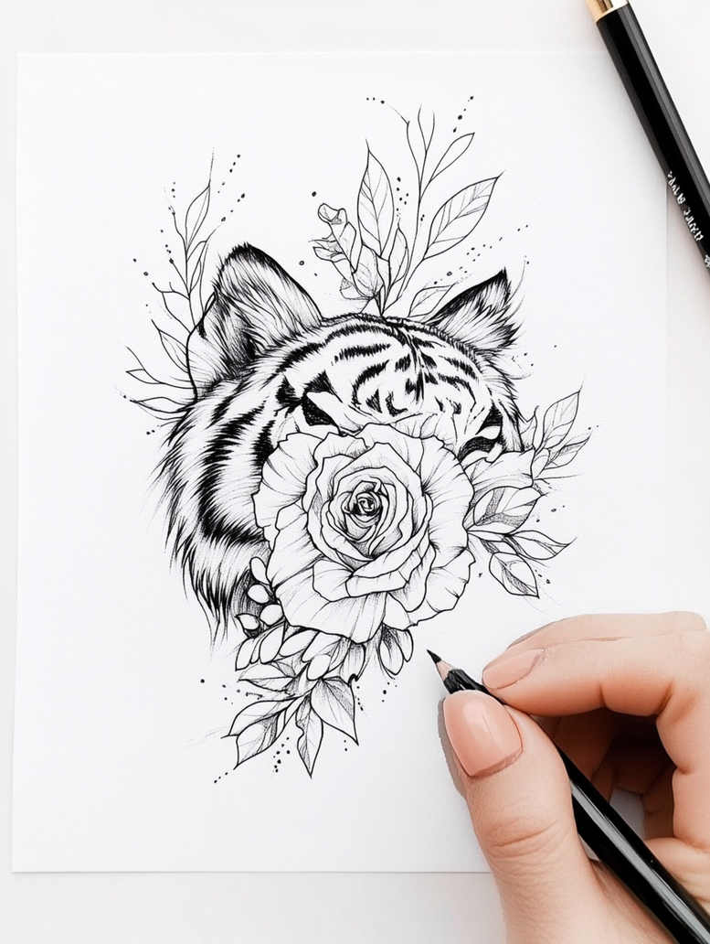 AI-generated tattoo concept presented as a refined line drawing that pairs a poised tiger head with a blooming rose integrated into its contour. Executed in pure black ink with subtle stippling and fine-line shading, the composition relies on crisp outlines and delicate hatchwork to define fur texture, petal folds, and the interplay between organic forms. Leaves extend outward from the floral cluster, creating a sense of movement and balance while framing the tiger’s gaze. Although presented as an idea for a tattoo, this design reads as a versatile concept suitable for the forearm, calf, or ribs and easily adaptable to different scales, from a small accent to a detailed sleeve. The central motif—a rose woven into the tiger’s profile—evokes themes of beauty and strength, a symbolic pairing used to signify guard and grace, courage and tenderness. The black-and-grey palette ensures high contrast against lighter skin tones and ages gracefully, while the fine-line approach preserves legibility on smaller canvases and preserves detail when scaled up. As an AI-generated tattoo project, it serves as a prototype for a custom tattoo design that blends realism with botanical elegance. In symbolism, the rose anchors tenderness while the tiger embodies power, with surrounding foliage anchoring the scene in nature and inviting reflection on resilience, transformation, and inner balance. For execution, a professional tattoo artist would adjust line weights, optimize negative space, and tailor shading to skin type, resulting in a timeless piece suitable for many wearers. Keywords to consider include tattoo, tattoo design, meaningful tattoos, fine line tattoo, rose tattoo design, flower tattoos, custom tattoo design, Japanese style tattoo, black and grey, realistic tattoo, body art, and ink.