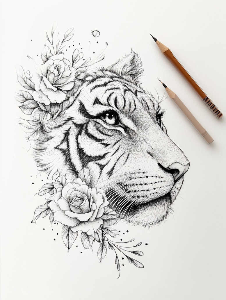 AI-generated tattoo project concept: This design presents a tiger head in profile in a crisp black and grey palette, adorned by a crown of roses and wispy leaves. The composition fuses realism with ornamental florals, placing the tiger’s steady gaze at the center while the floral elements weave around the jaw and temple, creating a dynamic silhouette that works well on the shoulder, upper arm, or chest. The line work is refined and micro-detailed, reflecting the fine-line tattoo style, with varied line weights to separate fur texture from petals and foliage. Shading is deliberately soft in the petals to preserve readability on skin, while the tiger’s stripes are rendered with bolder strokes to emphasize form and motion. Negative space and light stippling add subtle texture without overwhelming the subject, making this concept suitable for both standalone pieces and larger compositions. The symbolism blends strength and beauty: the tiger conveys courage and guardianship, the roses symbolize renewal and tenderness, a narrative of resilience and grace. For tattoo artists and clients, this concept demonstrates how floral motifs can harmonize with an animal portrait to produce a meaningful tattoo design that remains legible over time, even after aging of the skin. As a portfolio-ready concept, it leverages the keyword-rich language of tattoo design, including terms like minimal black-and-grey detail, small tattoos, and custom tattoo design, while nodding to broader styles such as Japanese-inspired line work and realistic tattoo approaches. AI-generated origin may appeal to clients seeking contemporary, tech-informed approaches to body art, while still delivering the timeless themes of ink, line precision, and expressive symbolism.