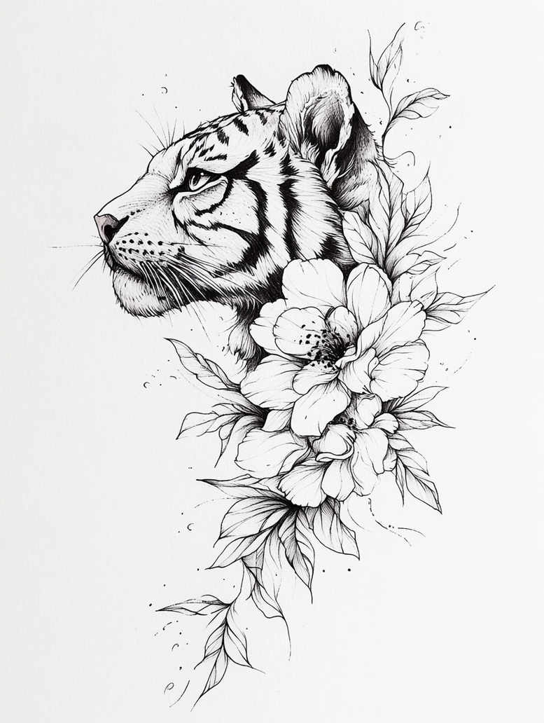 This tattoo design concept presents a tiger head in profile interwoven with a cluster of blossoms and leaves, rendered in clean black-and-grey line work. The main subject is the tiger: its watchful eye, bold stripes, and expressive muzzle are defined with precise contour lines and selective shading that builds form without heavy fill, allowing the piece to stay crisp on skin for years. Surrounding the animal, a bouquet of large petals and curling foliage creates a natural frame, guiding the eye from the animal’s gaze down into the trailing stems. The technique relies on fine-line precision, deliberate line weight variation, and subtle stippling to suggest texture, depth, and subtle velvety shading while preserving the crispness that keeps a tattoo legible over time. Negative space is used intentionally to prevent crowding and to allow the design to breathe, making it adaptable for placement on the forearm, bicep, shoulder blade, or along the ribs. The color scheme remains strictly black and grey, which enhances contrast and longevity and suits lovers of classic tattoo aesthetics. Symbolically, the tiger embodies courage, focus, and personal power, while the blossoms represent growth, renewal, and beauty—an expressive pairing that resonates with meaningful tattoos or personal mantras. The floral elements also soften the animal’s ferocity, creating a balanced composition that can be tuned to larger or smaller canvases by adjusting the number of petals or the extent of leaves. For devotees of the fine-line tattoo movement, this concept delivers a modern take on animal and botanical imagery, with potential for Japanese-style influences or a more naturalistic floral rendering. As an AI-generated tattoo project concept, it invites collaboration with a tattoo artist to refine line weight, shading, and exact placements, and to tailor the piece to the wearer’s anatomy and skin tone. The design encourages careful spacing, thoughtful transitions from bold outlines to delicate internal details, and a mindful approach to ink distribution to preserve legibility on aging skin. Overall, this is a refined fusion of fauna and flora that communicates resilience and elegance through ink, offering a tattoo design with deep personal meaning and enduring appeal.