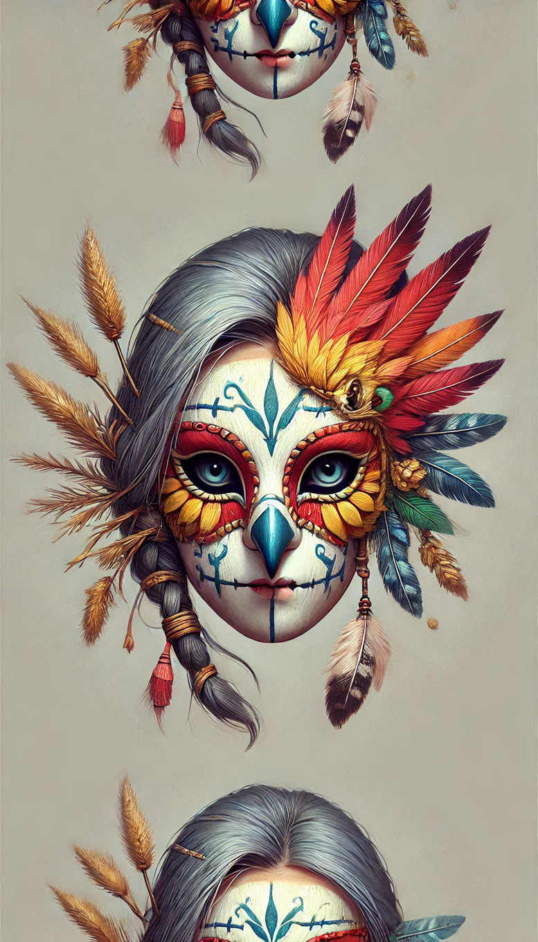 These AI-generated tattoo project concepts present a vivid, mask-inspired composition rendered in a high-contrast palette of blues, reds, yellows, and teals. The central element is a stylized face mask with blue geometric accents and a turquoise nose, framed by a lush headdress of multi-colored feathers and gray braided hair. The artwork nods to decorative sugar-skull motifs while employing precise line work and painterly shading to create depth and tactile detail. The face is pale with cool blue lines tracing symmetry across cheeks and chin, while the eye sockets are ringed in warm reds and yellows that frame bright blue irises. Surrounding the mask, elongated feathers in red, orange, yellow, and blue fan outward, balancing soft feather textures with sharp edge work to suggest movement and energy. The composition relies on bold color blocks and clean margins, designed to translate well to tattoo ink on the skin. The graphic patterns formed by the ornamental lines function as motifs that can be adapted for various sizes, from small tattoos to larger body-art panels, and they invite personalized symbolism—transformation, protection, festivity—while remaining visually striking as a design concept. Techniques imply a hybrid approach: fine-line precision for the facial contours and broader color saturation for the plumage, with gradients to convey curvature and distance. The piece doubles as a strong design study for clients seeking a meaningful tattoo, a statement piece, or a pattern-driven Japanese-style or contemporary mask tattoo, and it demonstrates how digital illustration can inform a real-world tattoo in ink. In summary, the tattoo design emphasizes color, pattern, and form, delivering an eye-catching motif that blends cultural aesthetics with modern tattoo language, scalable across placements such as forearm, calf, or back, all while maintaining a luminous, full-color look.