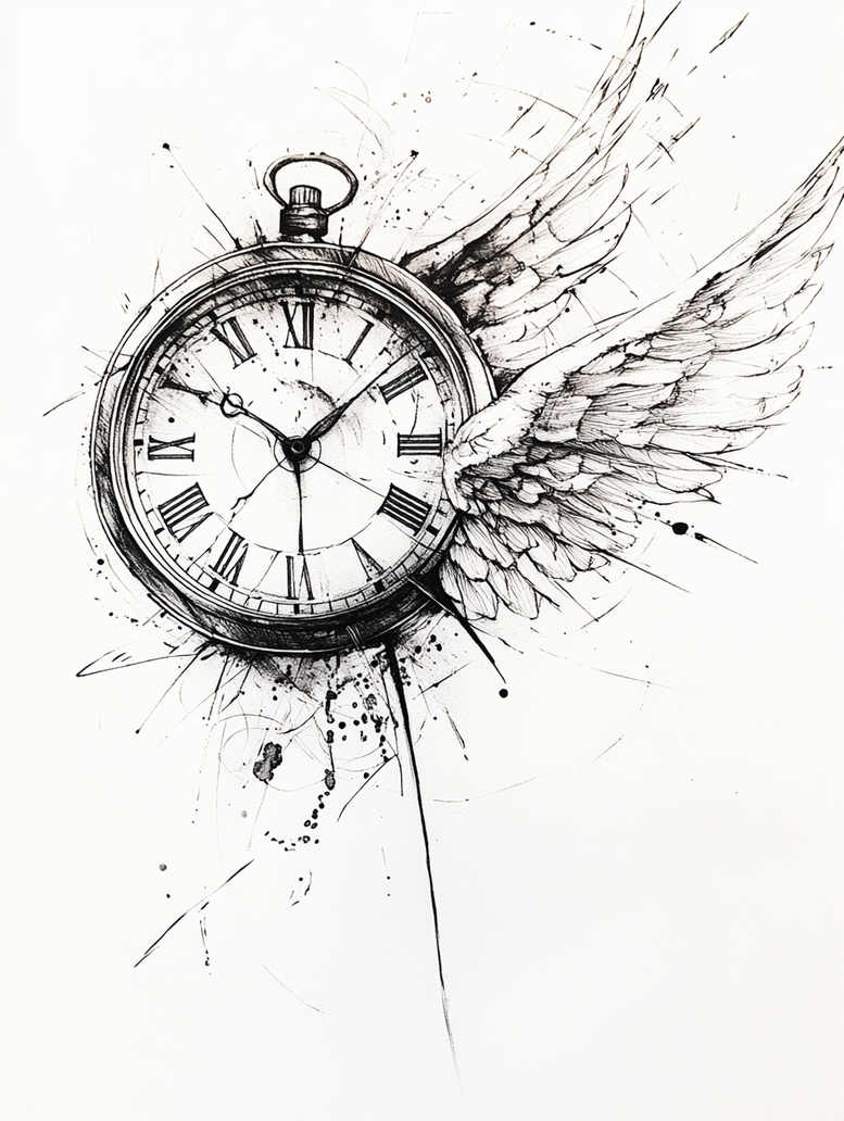 AI-generated tattoo project concept featuring a winged pocket watch rendered in fine line black and grey ink. This tattoo design fuses a classic timepiece with an expansive wing, evoking motion, memory, and the inexorable passage of time. The composition centers on a detailed pocket watch with Roman numerals, its circular casing shaded with careful grayscale gradients, a slender hour hand and a second hand crossing the dial, all executed in crisp linework. From the right side emerges a wing drawn with delicate feather structure, each plume built with fine lines, subtle cross-hatching, and nuanced shading to convey depth while preserving the brisk clarity that characterizes fine line tattoos. Splatter marks and radiating stray lines radiate outward, lending a controlled chaos that enhances energy without compromising legibility. The interplay between the metallic gleam of the timepiece and the organic texture of the wing creates a dynamic focal point that works beautifully as a standalone arm piece or as the hinge of a larger sleeve or chest composition. Symbolically, the watch can signify memory, endurance, or the value of moments, while the wing suggests aspiration, freedom, and protection—themes that resonate in many personal narratives and make this a meaningful tattoo design. As a concept, it invites variations in placement, scale, and additional motifs such as chains, blossoms, or Japanese-inspired elements, allowing inkers to tailor it to individual stories. The technique emphasizes clean, sustainable black ink on grey wash, with opportunities for subtle stippling to add texture and a sense of airflow around the feathered arc. This is presented as an AI-generated tattoo project intended to inspire clients seeking a timeless, bold black and grey piece with a refined silhouette and a touch of kinetic symbolism. Keywords: tattoo, tattoo design, meaningful tattoos, fine line tattoo, black and grey, realistic tattoo, body art, ink, custom tattoo design, winged watch, pocket watch design.
