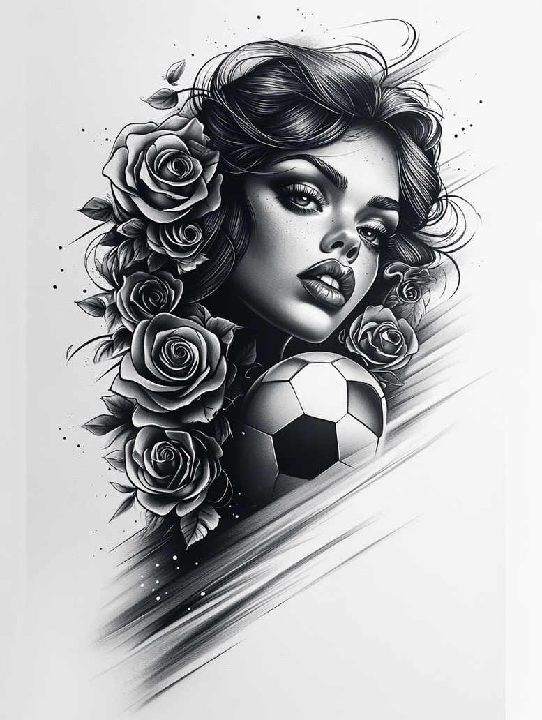 AI-generated tattoo project presents a bold grayscale portrait that merges natural beauty with modern geometry. The central element is a realistically rendered woman’s face, captured with soft highlights and dramatic black and grey shading that give a sculptural, lifelike presence on the skin. Surrounding her features, a cascade of roses arcs along the temple and jaw, each petal carved with delicate linework and subtle gradient transitions that convey texture, depth, and resilience; the roses symbolize love, growth, and renewal, while the composition’s diagonal sweep suggests motion and momentum. At the lower right, a soccer ball introduces a graphic counterpoint, its pentagonal panels defined with crisp edges and measured shading that echo the discipline of geometry within body art. The combination of organic florals and geometric form reflects a dialogue between humility and dynamism, a theme often explored in meaningful tattoos that balance softness with strength. The piece relies on black and grey ink to maximize contrast and longevity, using fine lines, stippling, and smooth gradients to achieve a realistic tattoo aesthetic while remaining adaptable to different skin tones. The design can be rendered as a large back piece or scaled for the forearm or calf, preserving legibility of the portrait when reduced for smaller placements. For collectors, this concept aligns with rose tattoo design, flower tattoos, and custom tattoo design trends that favor timeless monochrome palettes, fine line touches, and Japanese style tattoo influences through disciplined composition. As an AI-generated tattoo project, it serves as an inspiring template for artists and clients exploring a modern take on classic motifs, with potential to incorporate lotus flower tattoo or infinity tattoo symbolism if desired. The narrative behind the image—beauty meeting energy, love meeting sport—offers a personal hook for tattoo seekers looking to express meaningful tattoos about balance, fate, and forward motion in ink.